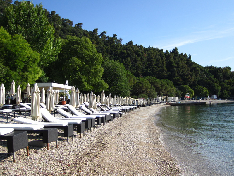 Zatrzymaliśmy się na małe zakupy, lody i spacer w Medveji, miejscowości, w której, według przewodnika, znajduje się piękna, szeroka plaża. Plaża faktycznie jest, ale nie nazwalibyśmy ją piękną, bo niestety "zagracono" ją leżakami: