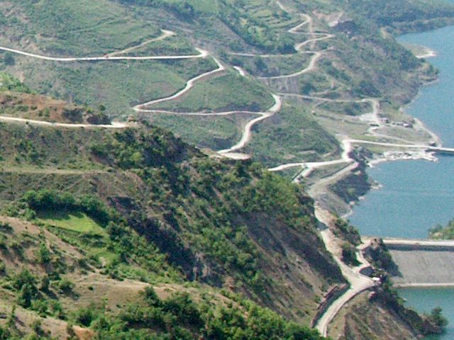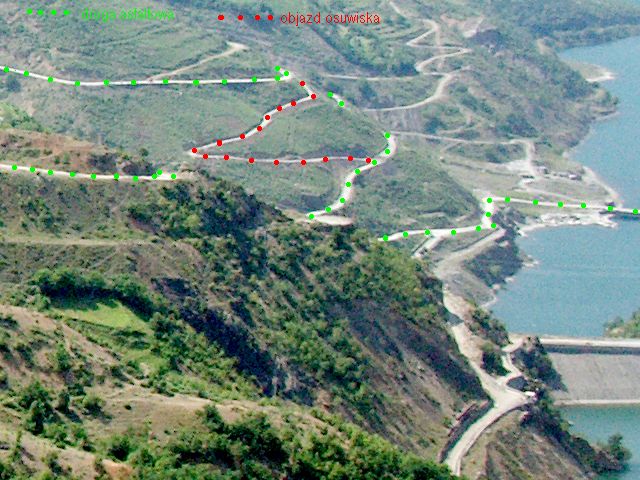 zostało zrobione na południe od mostu na Drinie w Fierze. Niestety nie mam zdjęcia tego miejsca w szerszym planie.Na zdjęciu wykonanym wcześniej (bliżej głównej drogi Kukes- Szkodra), widać grzbiecik schodzący w kierunku Drinu między mostem i zaporą. To na nim jest duże osuwisko, ale po drugiej (niewidocznej) stronie. Widać tam pierwotną, asfaltową drogę i objazd osuwiska. Jadąc z dołu mogliście nie zayważyć tego miejsca, bo na asfalcie był usypanu wał z kamieni, podobnie jak w dolnej części opbjazdu. Widać to na zdjęciu.
