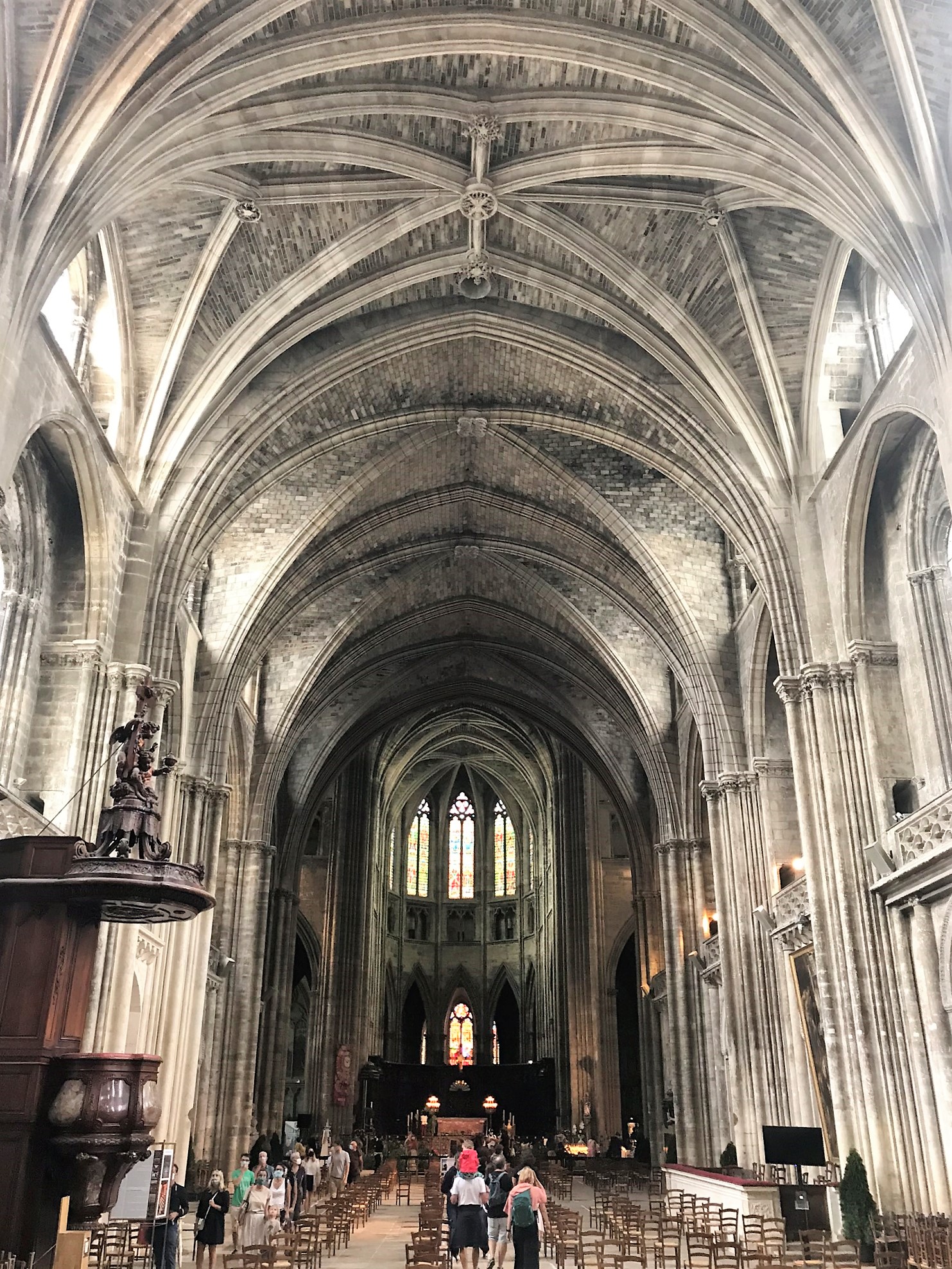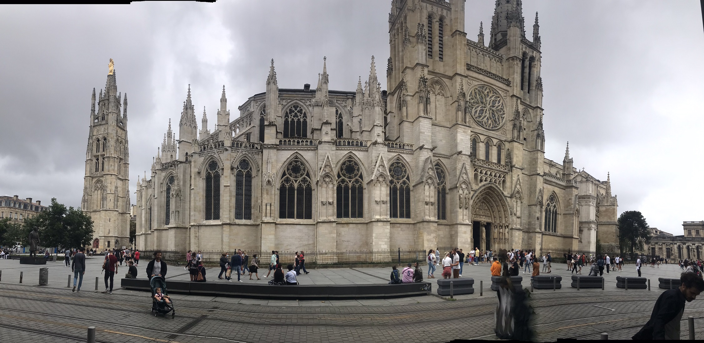 Przed nami Cathedrale Saint-Andre. Jest piękna, dostojna, ogromna, a jednak smukła i elegancka. "Historia romańsko-gotyckiej świątyni sięga pierwszych wieków chrześcijaństwa, zręby obecnej budowli zaczęły powstawać w XI w. Bliźniacze wieże sięgają na wysokość 81 m, a długość budowli to 124 m. Kościół figuruje na liście światowego dziedzictwa UNESCO."