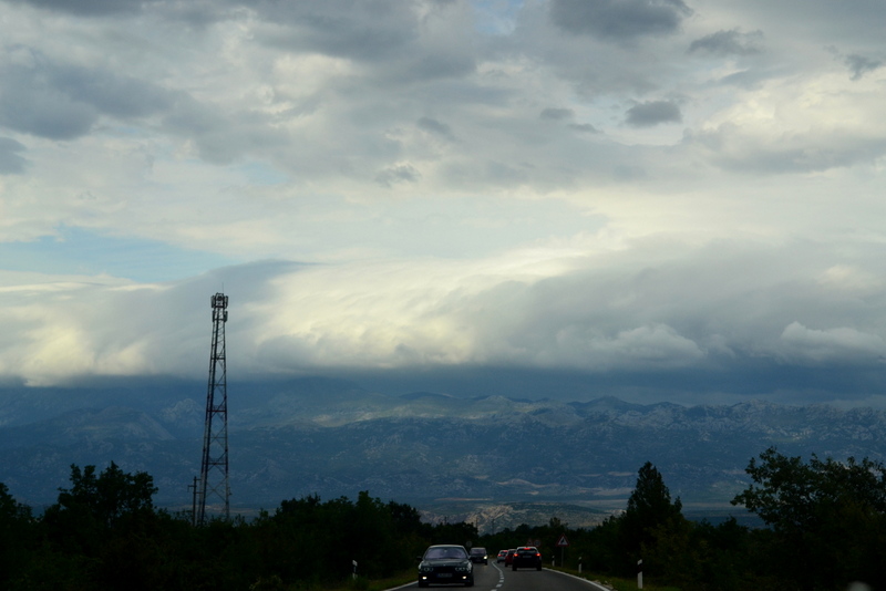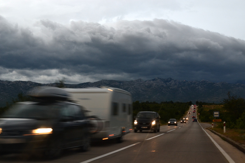Dopiero od krzyżówki w Gracac zaczynamy w miarę normalnie jechać (normalnie to tak 50 km/h) , zaczyna się ulewa i latające gałęzie drzew