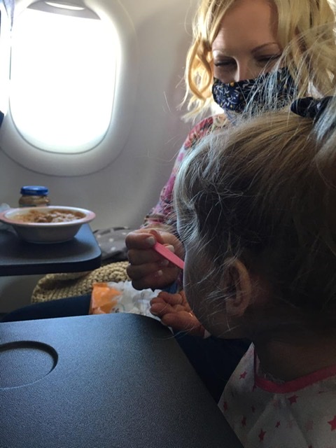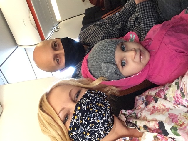 Jeszcze w samolocie przebieramy Hanę w lżejsze ciuchy. Wysiadamy... Niebo ma kolor szary.