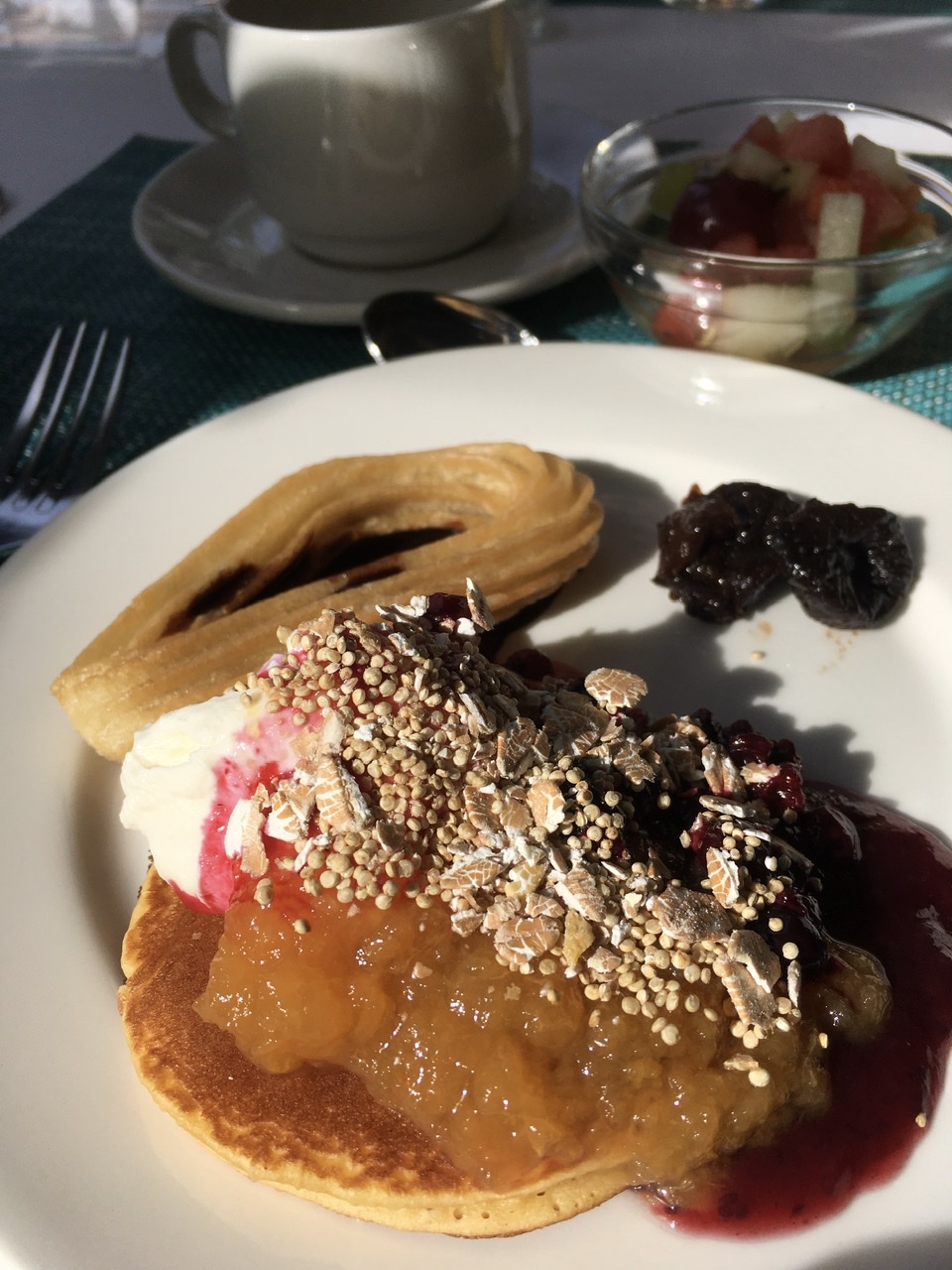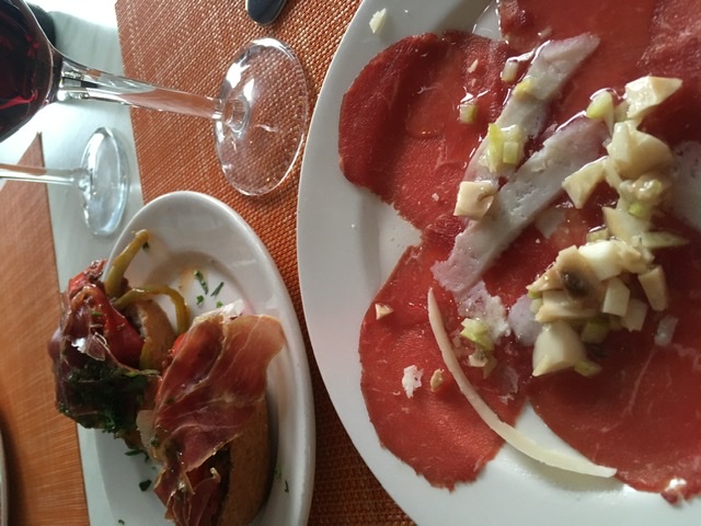 Kupujemy sobie zestaw przekąsek. Krakersy, całkiem dobry humus, oliwki, pastę paprykową. Kosztowało 10 euro. Smakowało. Było tego tyle, co kot napłakał...