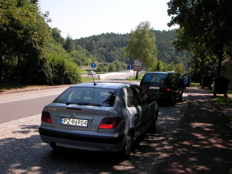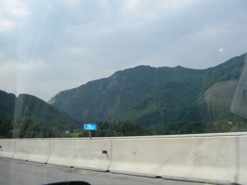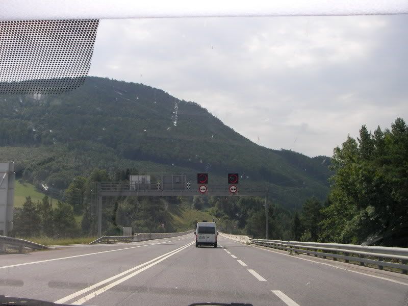 Trasę zaplanowałem przez Niemcy (przejście graniczne w Olszynie) - i to był dobry wybór bo praktycznie do samej granicy ruch był niewielki. Nastepnie wjechaliśmy na słynne niemieckie autobany - jeździ się po nich rewelacyjnie. Po minięciu Drezna zaczęło powoli świtać i jazda stała się jeszcze bardzie przyjemna. Praktycznie przez całą drogę w Niemczech prowadziłem ja, dopingując się redbullami. Dałem na jakieś 200 km poprowadzić żonie aby mogła pochwalic się że jechała z prędkościa zbliżoną do 200 km/h. Droga przez Niemcy mijała szybko i miło. Następnie wjechaliśmy do Austrii i tu trzeba było już raczej zmniejszyć prędkość do przepisowych 130 km/h. Piękne widoki na góry i pierwsze przejazdy tunelami sprawiały że jazda była przyjemna, choć już coraz bardziej doskwierało mi zmęczenie. Na dłuższy postój i rozprostowanie kości wybraliśmy parking pod Grazem