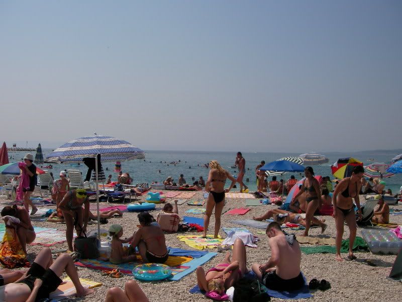 Rozpakowaliśmy się, wykąpaliśmy i poszliśmy coś przekąsić do jadłodajni. Wybór padł na pizze (35HRK) - był smaczna, popilismy piwkiem, przekąsiliśmy jeszcze sałatke ze świerzych warzyw i zrobilismy sobie spacerek po miejscowości. Potem wskoczylismy w stroje kapielowe i poszliśmy na plażę, załapać choć trochę promieni słonecznych i zamoczyć się pierwszy raz w morzu innym niż Bałtyk - przynajmniej ja. Rozczarowałem sie trochę, bo woda nie był aż tak ciepła jak sobie wyobrażałem. Była za to czysta, bez fal i słona jak diabli. Tak minął nasz drugi dzień wakacji. Pełni radości, że nasza podróż do Dalmacji szczęśliwie się zakónczyła wróciliśmy do pokoju.
