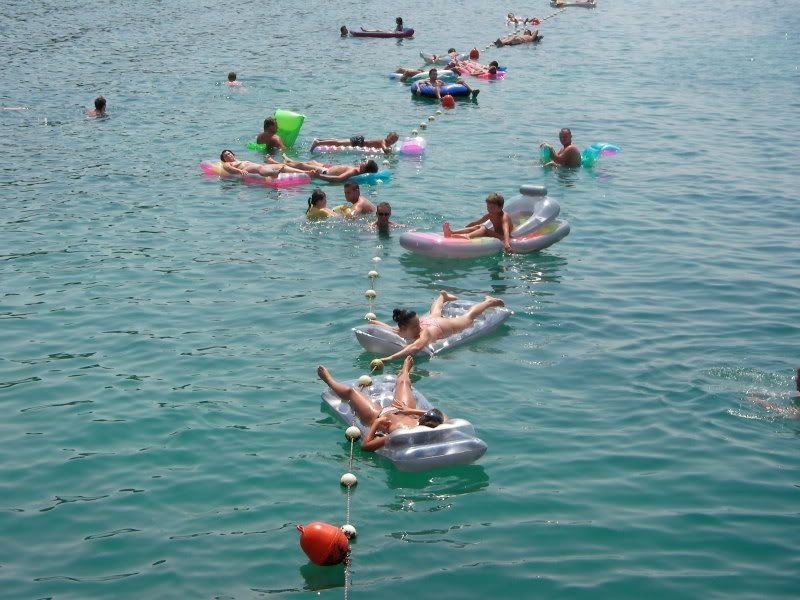 Następny dzień minął nam na plażowaniu. Pogoda była piękna - żal było nie pójść nad morze. Zmieniliśmy plażę z kamienistej na żwirową położoną obok przystani i parkingu cenralnego. Wyszliśmy zaraz po śniadaniu, około 8. Zabraliśmy cały nasz ekwipunek - czyli ponton, materac, 2 karimaty, maski i rurki do nurkowania, okulary słoneczne, buty do pływania, kremy i olejki do opalania z wysokim faktorem. Plaża okazała się jeszcze pusta, ale z każdą minutą wypełniała się coraz większą ilościa plażowiczów. Wokół naszego "kojca" rozlokowałem materac, ponton, sandały tak aby zapewnić nam odrobinę swobody i uniemożliwić wejście innym nam "na głowę".
