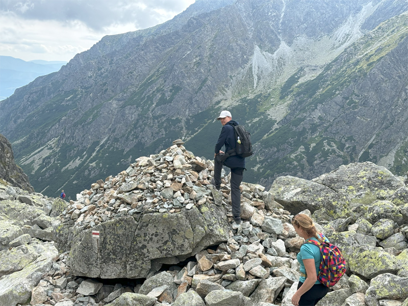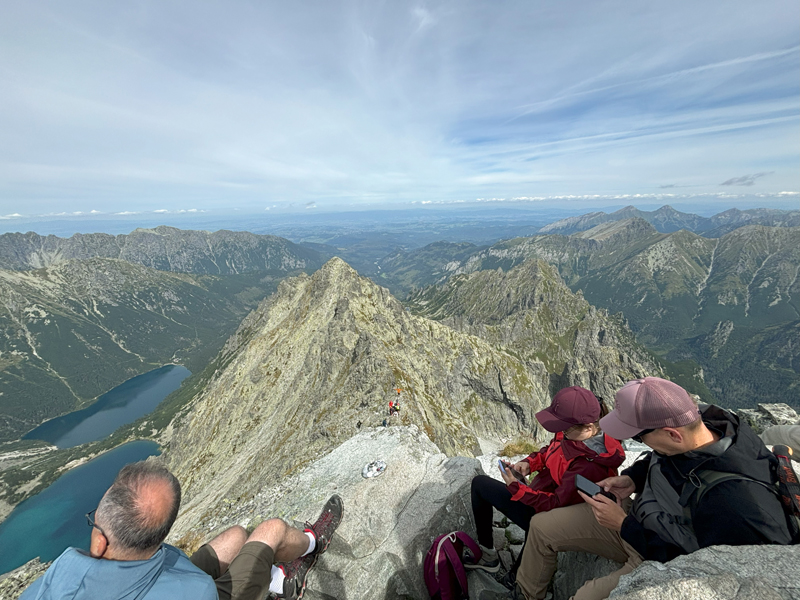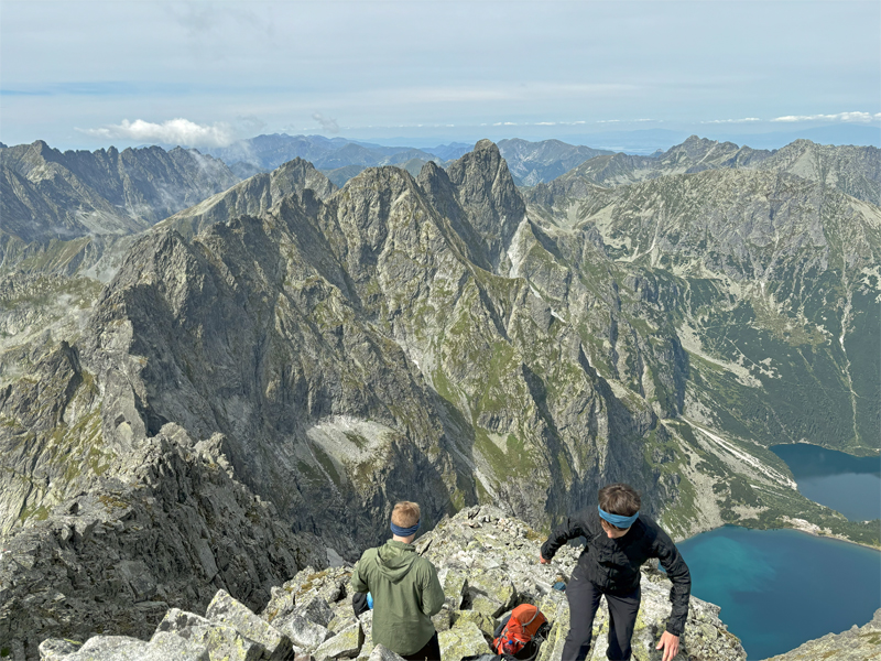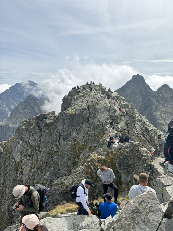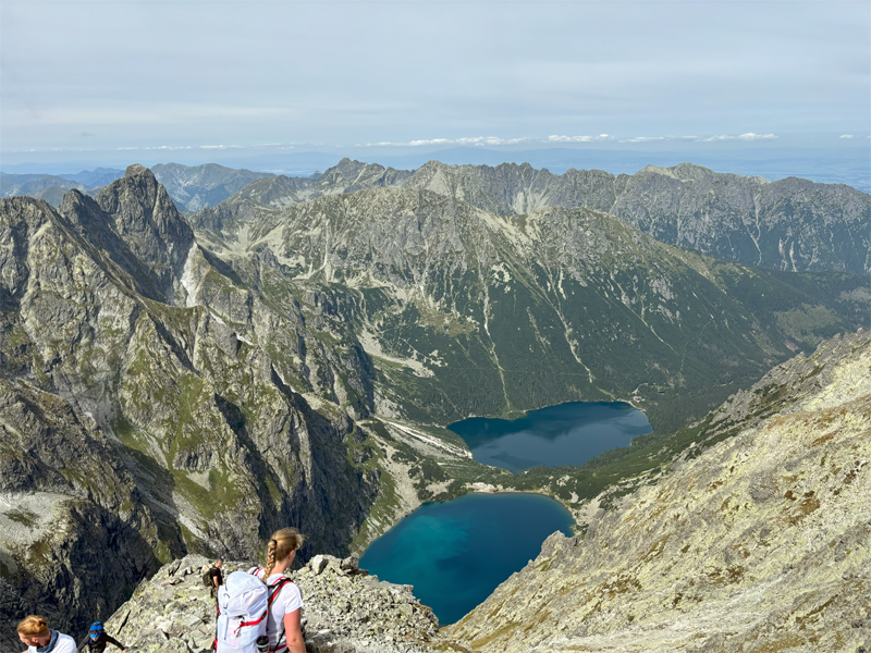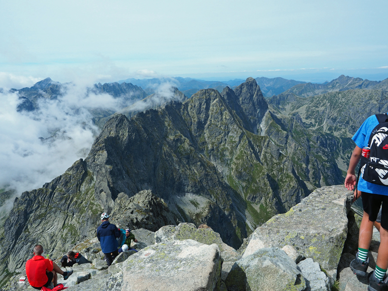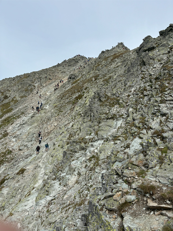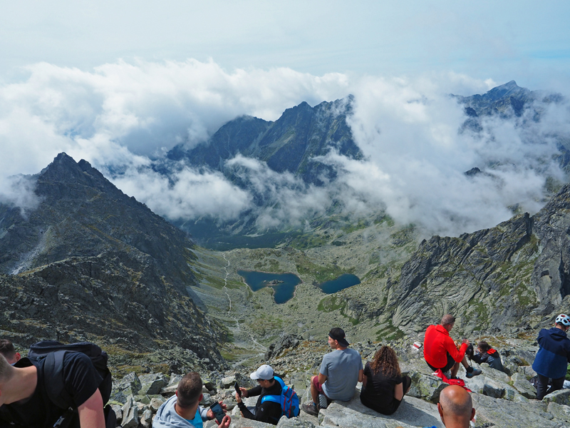 My już w mniej eksponowanym miejscu. U góry po lewej graniczny wierzchołek Rysów (2499 m) a po prawej ten leżący po słowackiej stronie (2503 m). Ludzie na jednym i drugim.