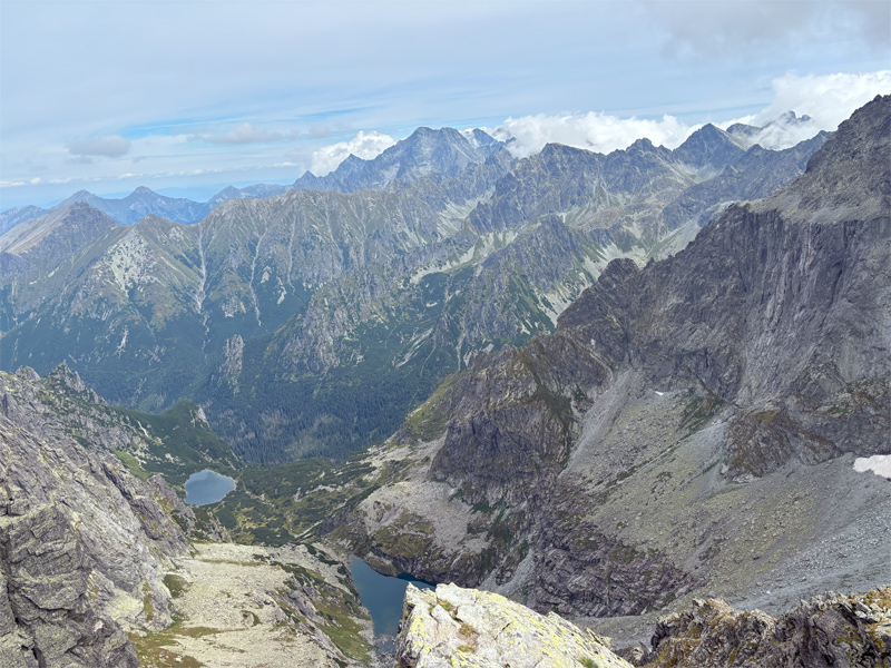 Leżące w dole Mięguszowieckie Stawy i biegnący obok nich szlak wydają się na wyciągnięcie ręki. Jednak stok w pewnym momencie kończy się urwiskiem i zapewne dlatego szlak obchodzi te miejsce odbijając w lewo w kierunku Przełęczy Waga a z niej skręca do schroniska.