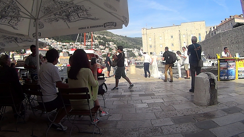 Oczywiście był też fotograf, który uwieczniał każdy ich krok. Młodzi weszli na statek na którym przywitali ich goście weselni. Nie wiem, czy to na tym statku miało się odbyć wesele (chyba troszkę ten stateczek był za mały), czy też mieli nim tylko przepłynąć tam, gdzie to wesele miało się odbyć (np. na wyspę Lokrum). W Chorwacji, tak jak i w Polsce, śluby i wesela odbywają się w soboty, więc jeśli w tym dniu zdecydujcie się na jakąś wycieczkę, to na pewno będziecie mieli okazję rzucić okiem na jakąś parę młodą, przechadzającą się ulicami odwiedzanego przez Was miejsca.