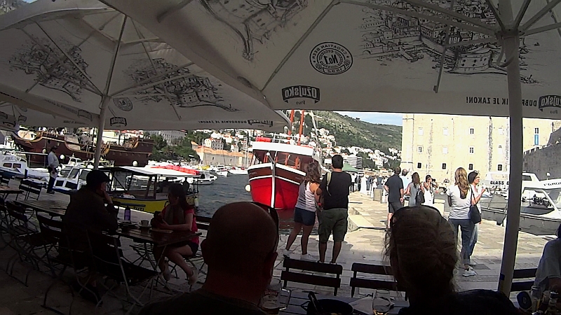 Dubrownik - późne popołudnieW 2013 roku przechodząc pomiędzy stolikami jednej z knajpek usytuowanych przy porcie w Dubrowniku zobaczyliśmy, jak ludzie zajadają się owocami morza z wielkiej patelni ustawionej na środku stołu. Aż nam ślinka poszła i stwierdziliśmy, że też chcemy zjeść takie danie. Po rozstaniu z przewodniczką, która oprowadzała nas po tym pięknym mieście, wróciliśmy do portu i usiedliśmy przy stoliku w tej knajpce, w której wcześniej zobaczyliśmy interesującą nas potrawę. Konoba nazywa się Lokanda Peskarija i znajduje się pod tymi parasolami (po prawej te większe parasole i po lewej te mniejsze).