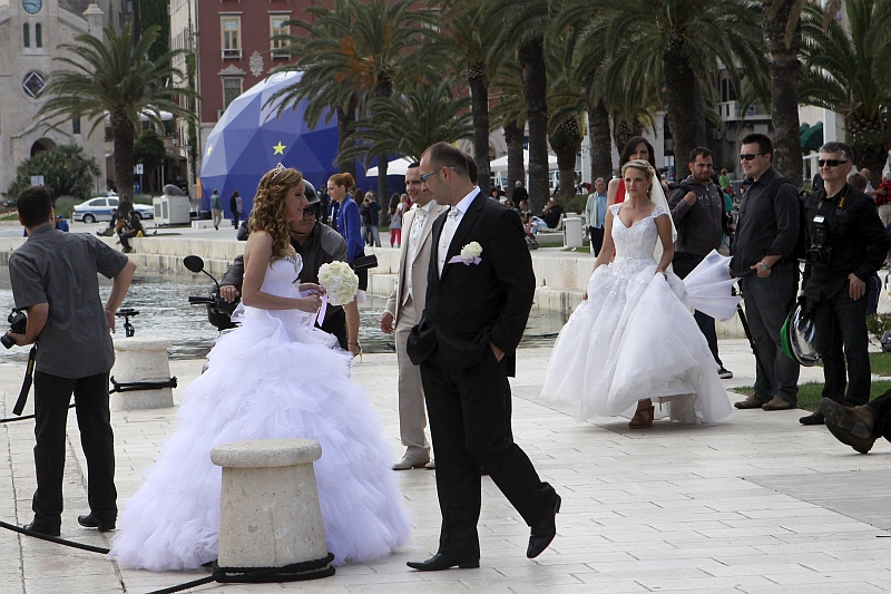 My w 2013 roku w Splicie na Rivie spotkaliśmy dwa orszaki weselne, które, jak się okazało, zmierzały do jednego punktu na Rivie (chyba jest to miejsce, które młode pary upodobały sobie jako plener zdjęciowy). Sytuacja była przezabawna, bo orszaki szły z dwóch stron i jak się wzajemnie dojrzały, to zaczęły prawie biec, aby być pierwszym w tym określonym miejscu. Myśmy się pokładali ze śmiechu z tej sytuacji.