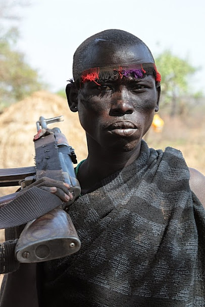 Większość, a prawie wszyscy wojownicy Mursi noszą zamiast oszczepu i noża teraz karabinu AK47 aby polować i bronić się.