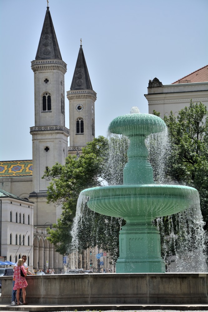 Na przeciwko fontanna i widok na kościół św. Ludwika. Ma przepiękny dach, ale z poziomu chodnika widać tylko kawałki barwnej dachówki.