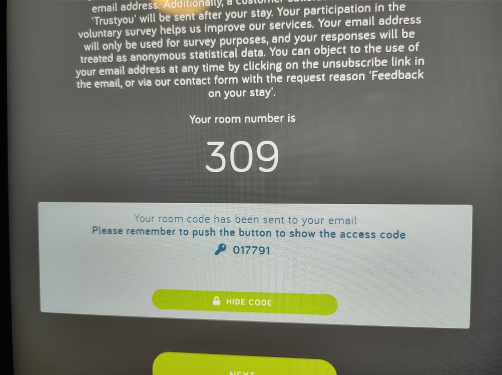 Ale na szczęście wpisane dane z Bookingu działały wcześniej i dostajemy elektroniczny kod do otworzenia drzwi i wjazdu do parkingu podziemnego. Należy sobie zrobić zdjęcie, choć na maila przychodzi też ten kod, ale zawsze go lepiej mieć dodatkowo.
