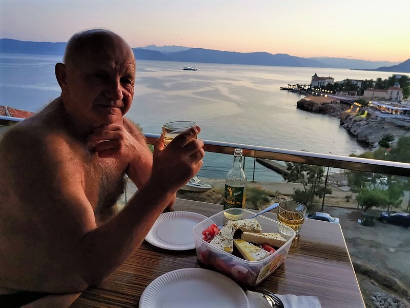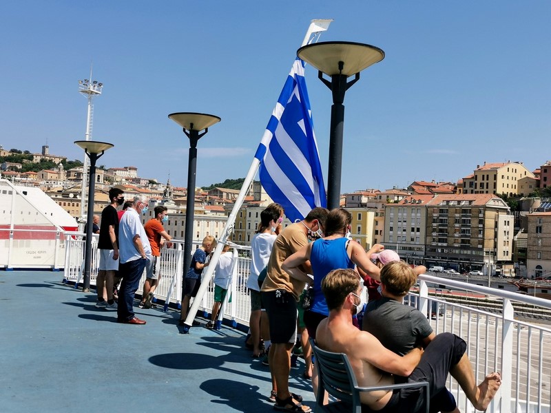 Jako możliwą do realizacji i w miarę bezpieczną, chociaż nie najtańszą, wybraliśmy drogę przez Włochy. Atrakcja kosztowała 450,6 € za kabinę wewnętrzną na trasie Ancona- Igoumenitsa. Bilety kupiliśmy 3 dni przed wyjazdem (na stronie anek.gr) z opcją odbioru w porcie. Cena obejmowała zniżkę dla seniora 60+ wielkości 50€/osoba. Jak na moje pierwsze emeryckie doświadczenie, było całkiem ok