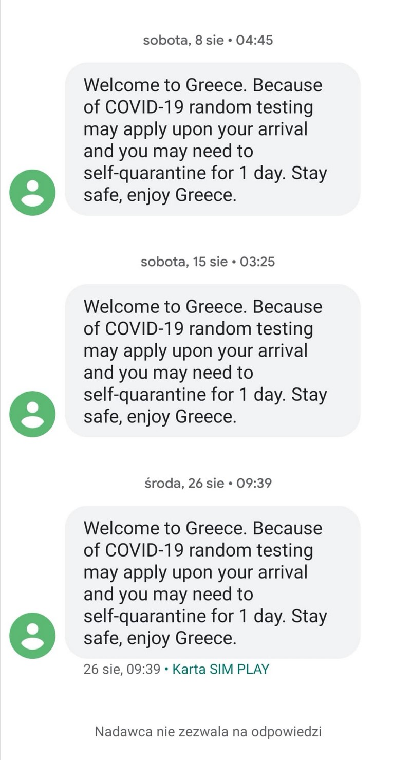 Na szczęście poszło błyskawicznie. Wymaz stanowiło muśnięcie wacikiem migdałka podniebiennego i z całą pewnością, nawet u zakażonego, nie mogło niczego wykryć. Ale greckie służby sanitarne działają mniej więcej tak jak polskie i co tydzień w sobotę rano witał nas taki sms.