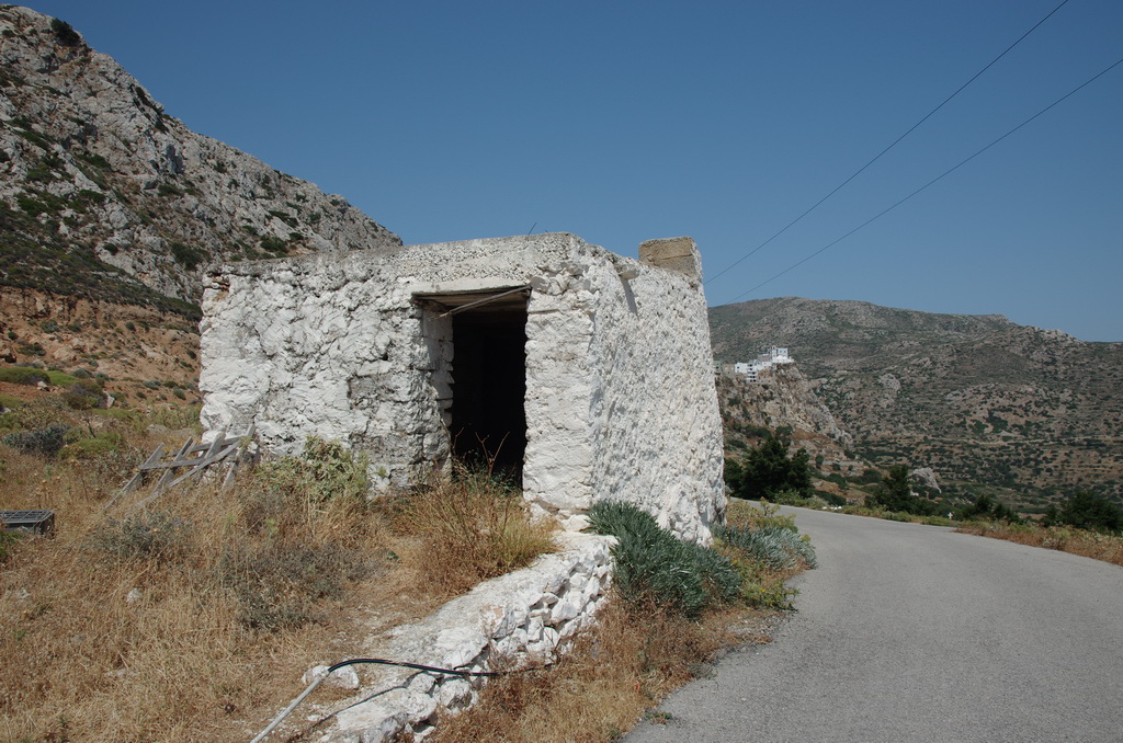 Pierwszy raz w Grecji spotykam się z konstrukcjami innymi, niż okrągłe "wieże". Te mają kształt zamkniętej litery U. Tuż obok stoi jakaś kapliczka