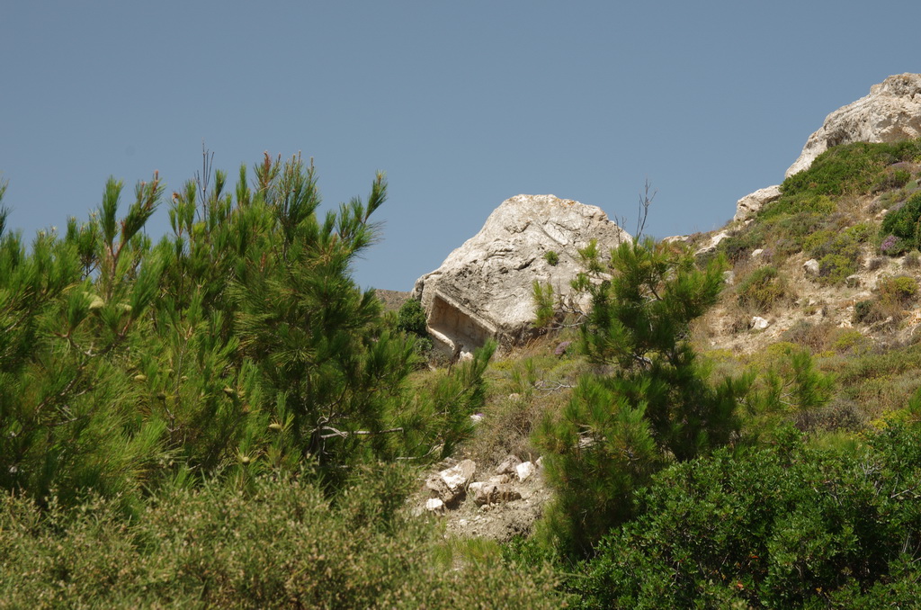 docieramy do najstarszego zabytku na wyspie. Odkryte w 1971, przy okazji budowy tutejszej drogi, mykeńskie cmentarzystko z 14 wykutymi w skałach grobami.