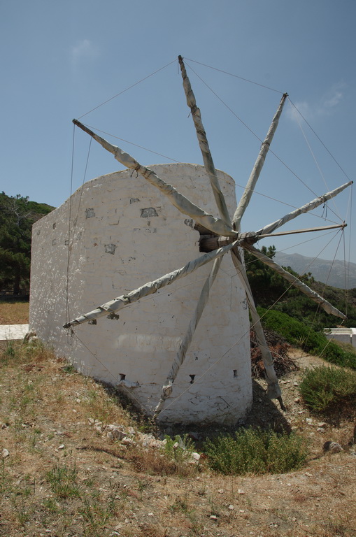 z bardzo dobrze zachowanym wiatrakiem (jakże inne są te na Karpathos)