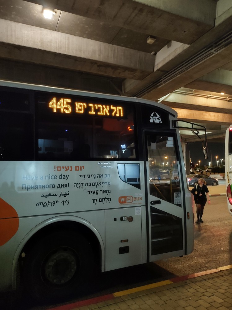 Autobus 445 jeździ co godzinę do Tel Avivu, nie kursuje w szabat.