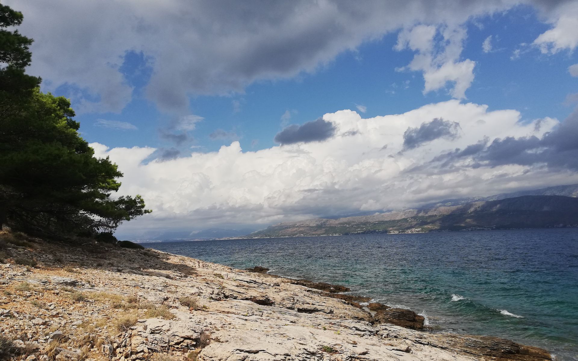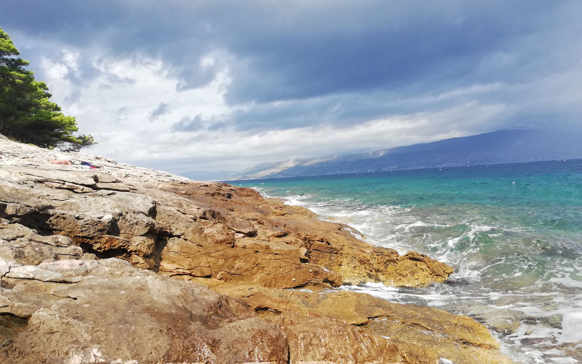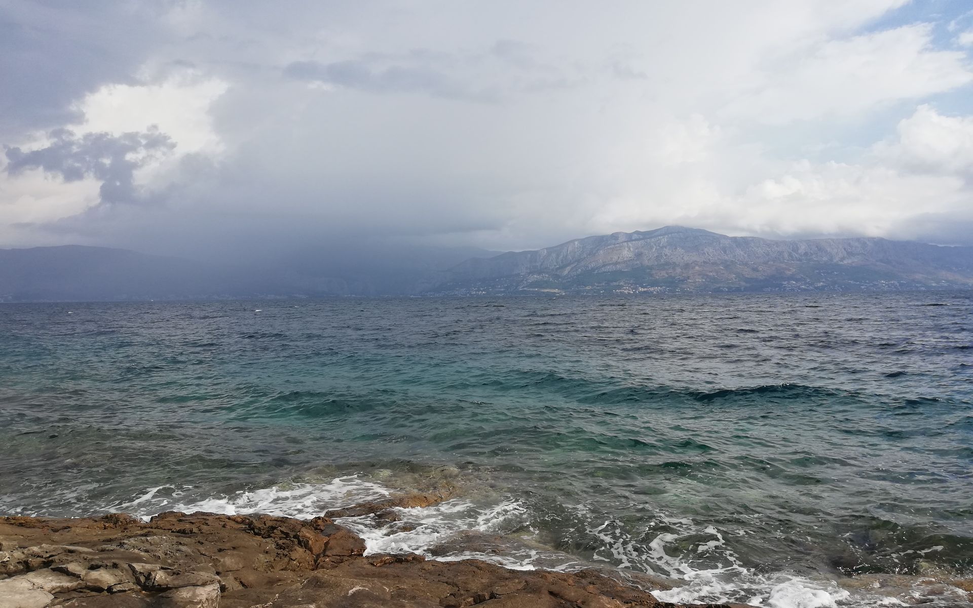 Wyglądało, że to może być ładny dzień. Poranne, codzienne rytuały i… no nie za ciepło. I pogoda jakaś taka… Podjęliśmy decyzję, że nie jedziemy nigdzie, bo w zapowiedziach deszcz, ale spróbujemy na „naszą” plażę w Postirze. Doszliśmy a tam… „ZONK” na naszym miejscu „sąsiedzi – Polacy z prawej” których opisałem w poprzednim odcinku. No co za ludzie ha ha… Normalnie trzeba będzie o 5tej rano parawan tu przynosić… Minęliśmy ich, pośmialiśmy się… Pomyślałem, poczekaj, pokażę Twoje ciało (zoom) w relacji, będziesz miała karę (żart) No i to była jedyna radość tego dnia do południa, bowiem chmury zbliżały się od lądu