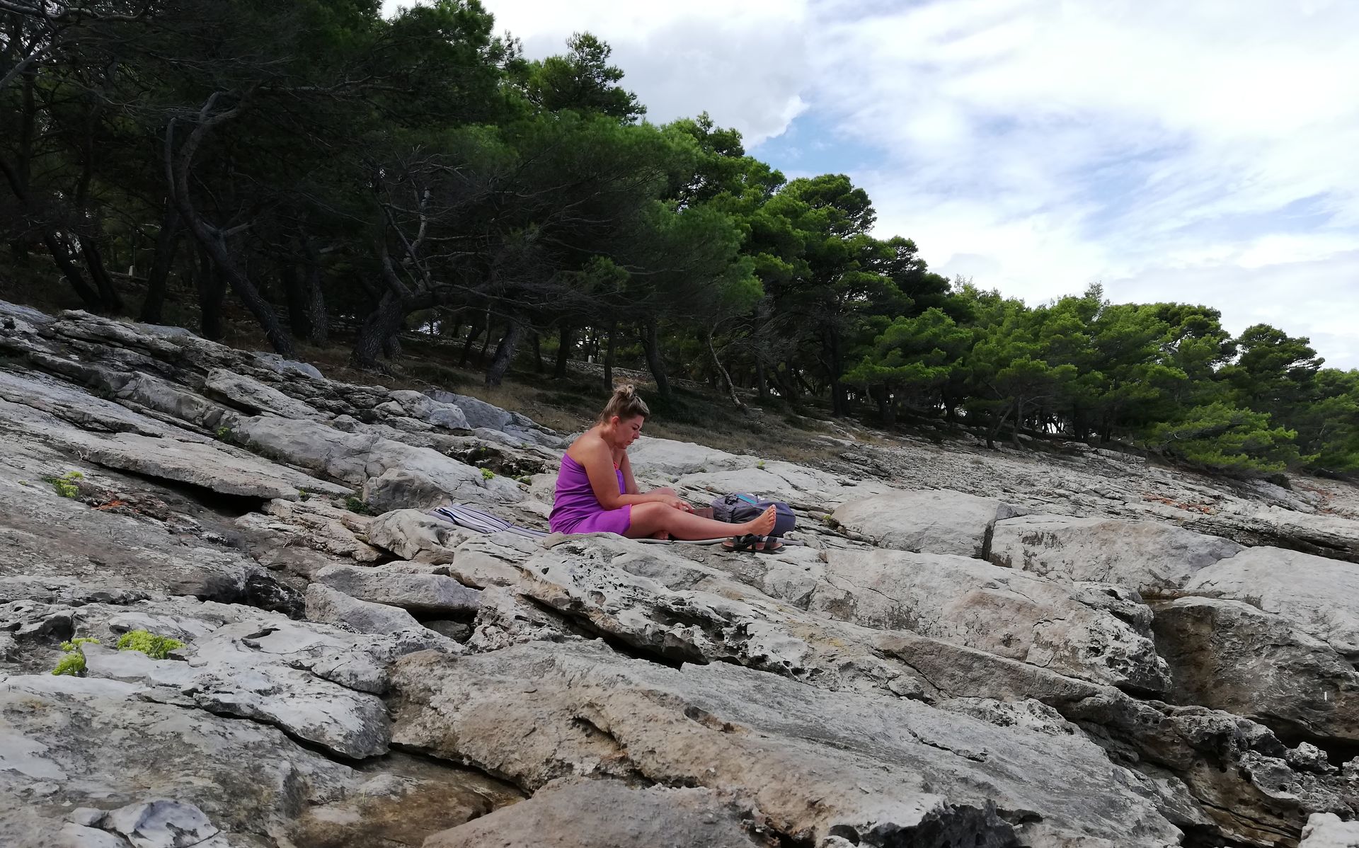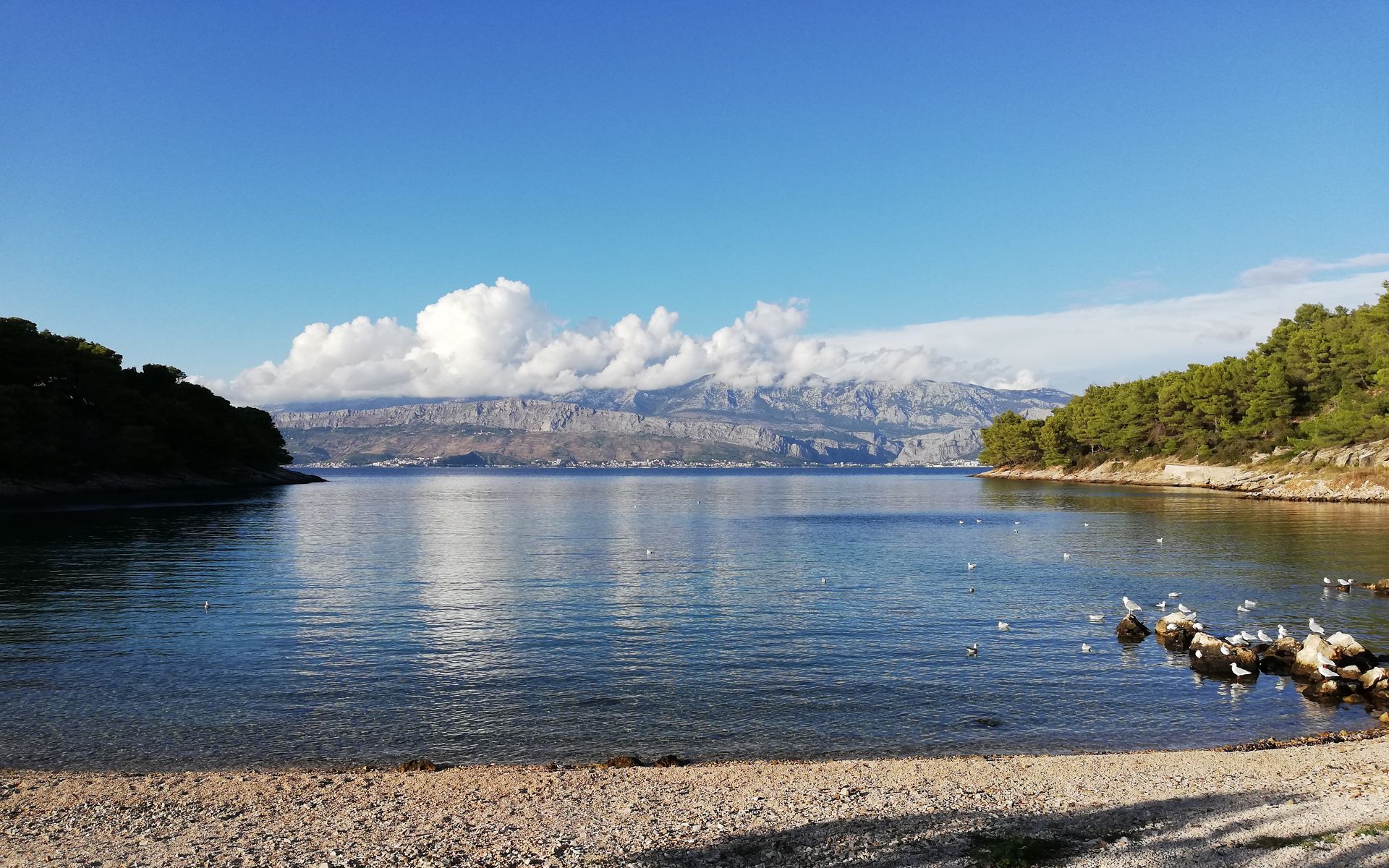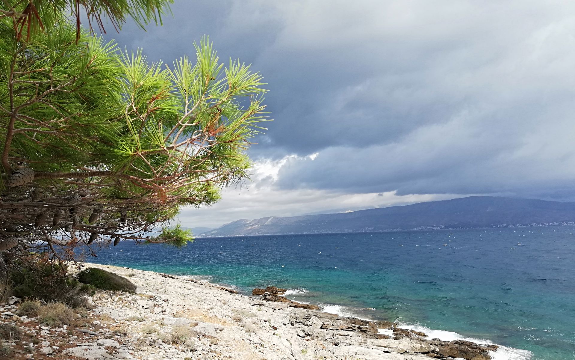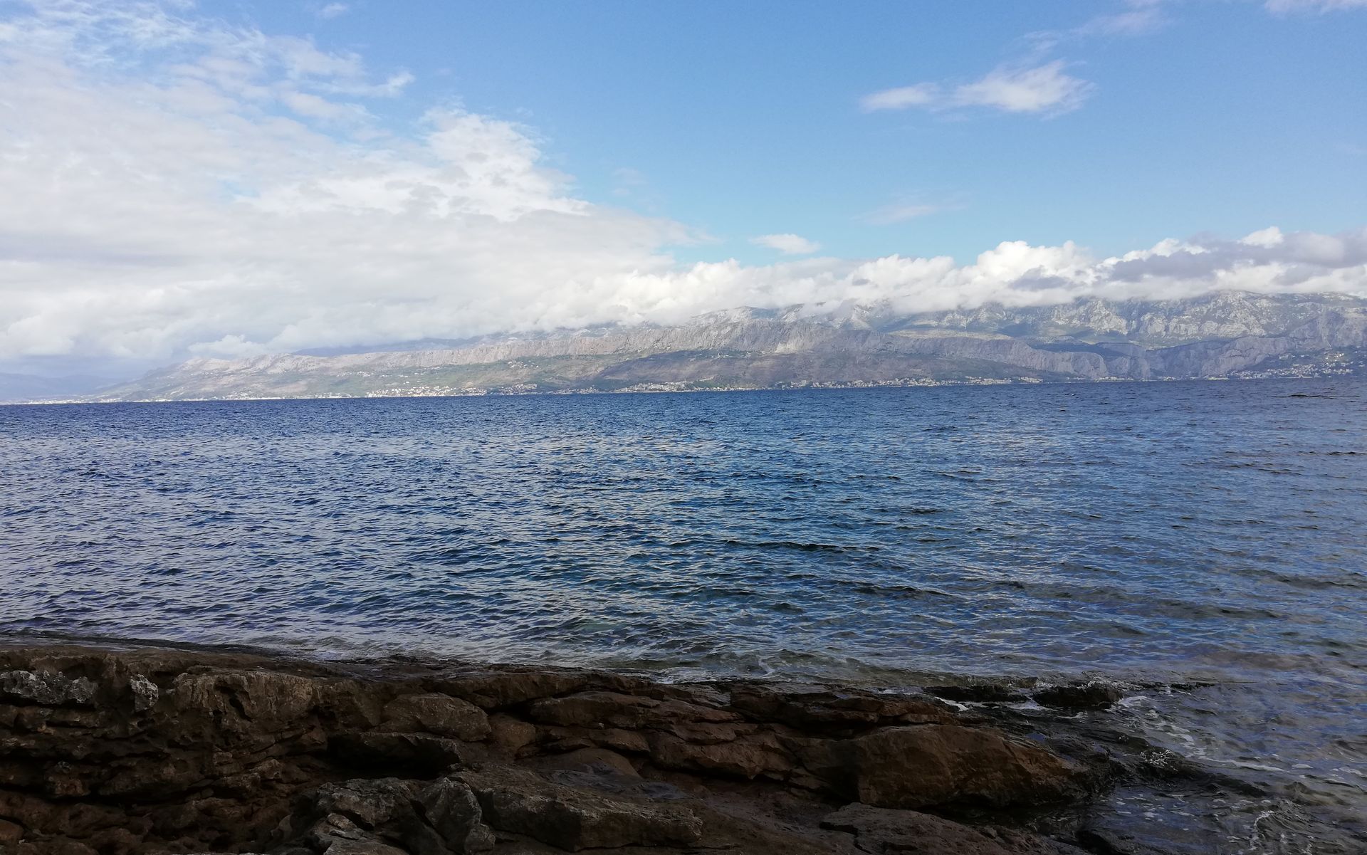 Wyglądało, że to może być ładny dzień. Poranne, codzienne rytuały i… no nie za ciepło. I pogoda jakaś taka… Podjęliśmy decyzję, że nie jedziemy nigdzie, bo w zapowiedziach deszcz, ale spróbujemy na „naszą” plażę w Postirze. Doszliśmy a tam… „ZONK” na naszym miejscu „sąsiedzi – Polacy z prawej” których opisałem w poprzednim odcinku. No co za ludzie ha ha… Normalnie trzeba będzie o 5tej rano parawan tu przynosić… Minęliśmy ich, pośmialiśmy się… Pomyślałem, poczekaj, pokażę Twoje ciało (zoom) w relacji, będziesz miała karę (żart) No i to była jedyna radość tego dnia do południa, bowiem chmury zbliżały się od lądu