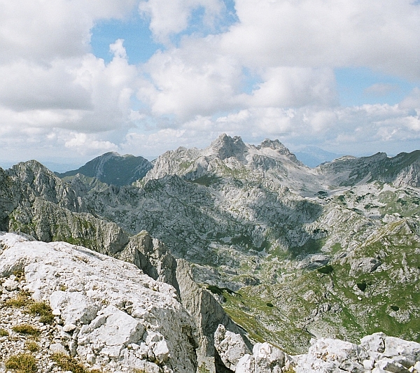 Niebo przykrywają niestety coraz liczniejsze chmury, rzadko przebija się słońce. Na wschodzie i południu rozciąga się Sinjajevina i inne góry nieznane nam jeszcze z nazwy, poza tym otacza nas Durmitor. Jak na wyciągnięcie ręki jest Meded, stąd wydaje się sporo niższy, widać nawet na nim ścieżki szlaków, Terzin Bogaz, dalej wyniosły Bobotov Kuk. W dole tuż pod nami leży głęboka, skalista dolina Velika Kalica, widać mały płat wiecznego śniegu Debeli Namet na piargach opadających ze ściany Sljeme oraz blaszaną budkę Alpejskiego Bivaku.