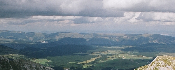 Bez żadnego plecaka tylko z aparatem i kamerą wędruję wzdłuż grzbietu. Idzie się po trawie, ścieżek nie ma, teren jest prawie płaski. Oprócz zdobycia szczytu bardzo chcę również wreszcie zobaczyć tę osławioną ścianę Prutasa i góry Stit, może wreszcie się odsłoni. W końcu udaje mi się to, ale to za daleko, żeby dokładniej coś zobaczyć, poza tym jest jednak ledwie widoczna. Nie wpisuję się do zeszytu bo w puszce są tylko jakieś pogniecione resztki kartek i szybko wracam. Widoki z głównego szczytu nie były jakoś szczególnie inne niż wcześniej, może jakbym doszedł na sam koniec grzbietu do Milosev Toka byłoby lepiej, ale na to nie mam za bardzo czasu i ochoty.