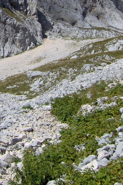 Gdy po chwili ruszamy dalej musimy się zmierzyć z najtrudniejszym odcinkiem trasy. Przechodzimy wąską półeczką pod ścianą i zaczyna się stromy, kamienisty żleb prowadzący na grzbiet Sljeme. Podobno jest to jedno z dwóch miejsc (obok końcowego podejścia na Bobotov) gdzie w Durmitorze są zabezpieczenia....... Przejście jest jednak dla nas bardzo łatwe, choć strome, a po wspomnianych ubezpieczeniach pozostały już tylko jakieś resztki w postaci wbitych w skały prętów. Trzeba trochę uważać i tę część trasy po skałach pokonujemy 'na czworaka'.