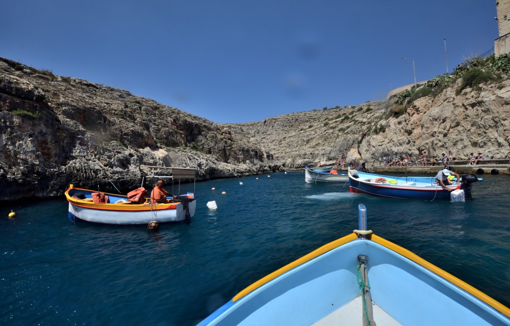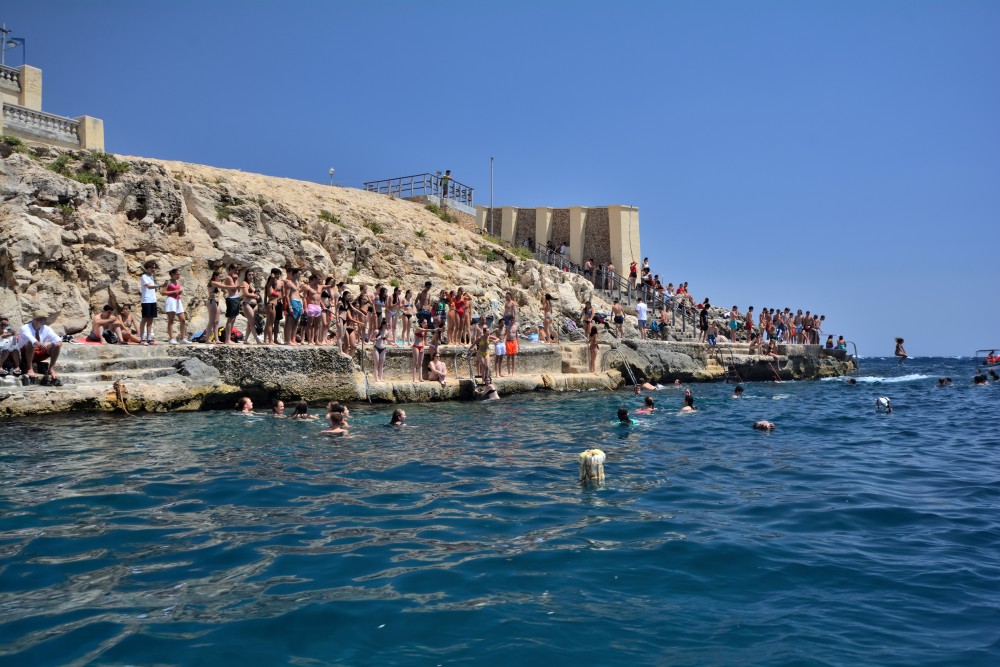 Dopływamy do przystani, ludzie cały czas skaczą sobie do wody.