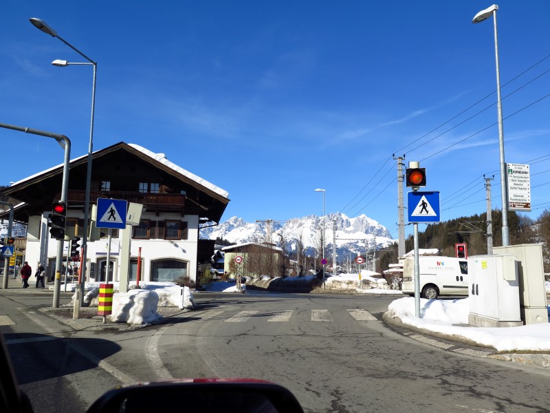 W centrum Kitzbühela zatrzymują nas światła: