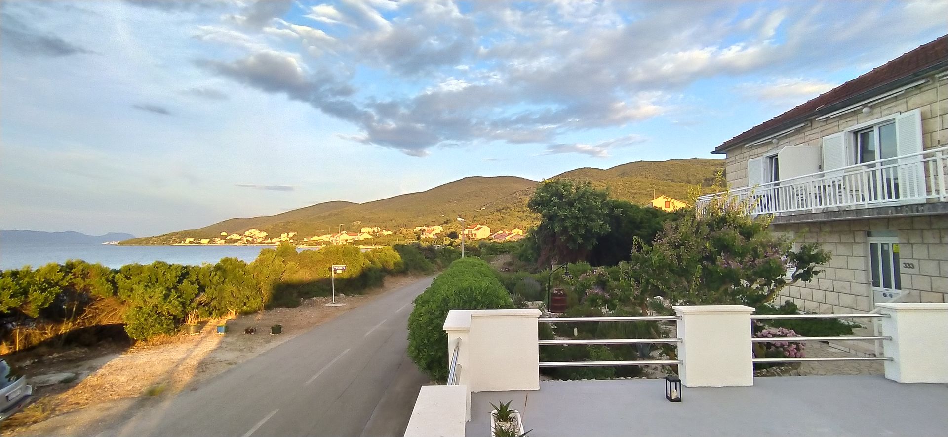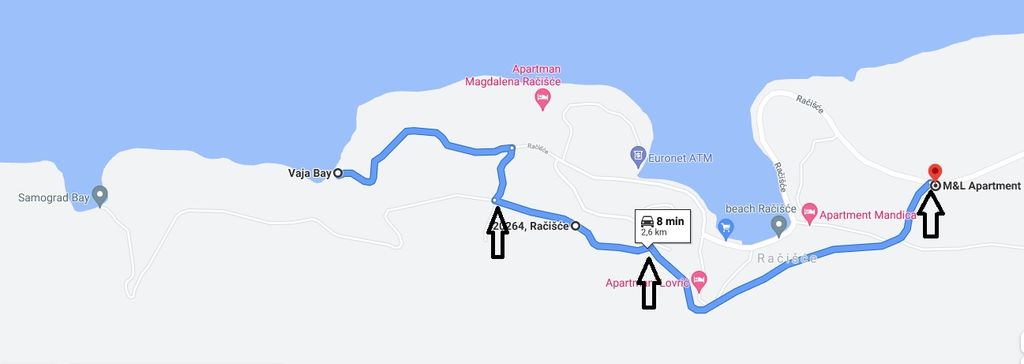 Strzałka przy M&L Apartment pokazuje pierwszy drogowskaz kierujący na drogę objeżdżającą miejscowość i kierującą do plaż Vaja i Samograd. Dziwne, ale gdy poprzedniego dnia zwiedzaliśmy Raćišće i jechaliśmy koło niego tablica z nazwami plaż była zamontowana na drogowskazie, ale kolejnego dnia leżała już w trawie przy nim…