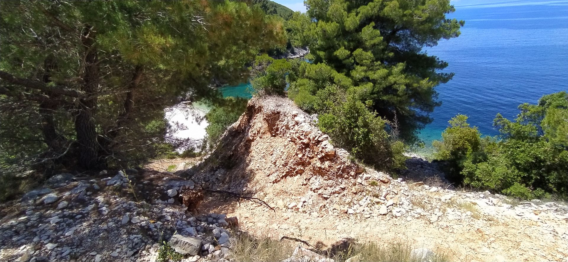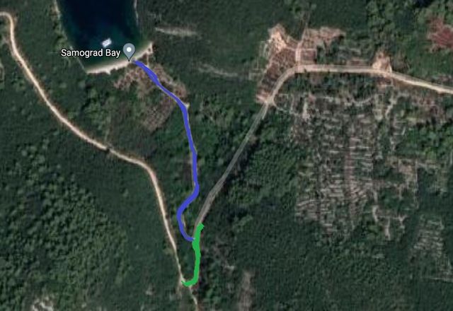 Odcinek od Apartment Lovrić do drugiej w lewo strzałki jest stromy i wąski. Dobrze, że nie jechało z góry żadne auto. W miejscu strzałki drogowskaz na plaże Vaja i Samograd jest.