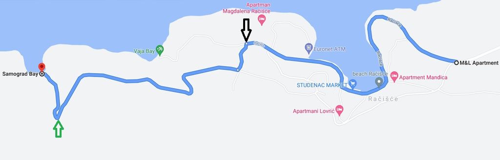Mając w głowie obserwacje ze spaceru po Raćišće, dotyczące umiejscowienia drogowskazów na plażę Vaja, z której uroków chcieliśmy skorzystać pierwej wyznaczyliśmy sobie poniższą drogę i ruszyliśmy.