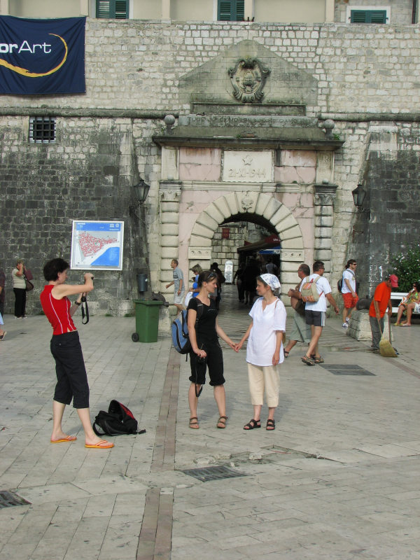 Schodzimy. Zaczynam coraz poważniej myśleć, że z naszego spotkania nici. Do odwrotu trąbka wzywa. Trzeba wracać. Trudno. Naraz - znajomy sygnał. Jest sems! Ula pisze, żeby jeszcze chwilę zaczekać, bo są już w Dobrocie i zaraz przyjadą do Kotoru. Duża czerwona i mała czarna pod zegarem. Dobra! Więc jednak! Z rozpoznaniem się nie mamy najmniejszych problemów. Witamy się jak stare, dobre znajome.