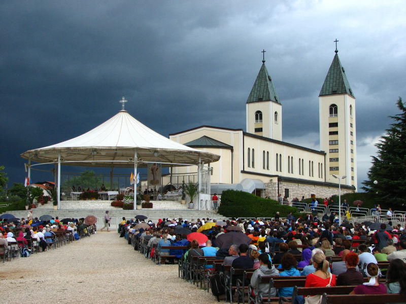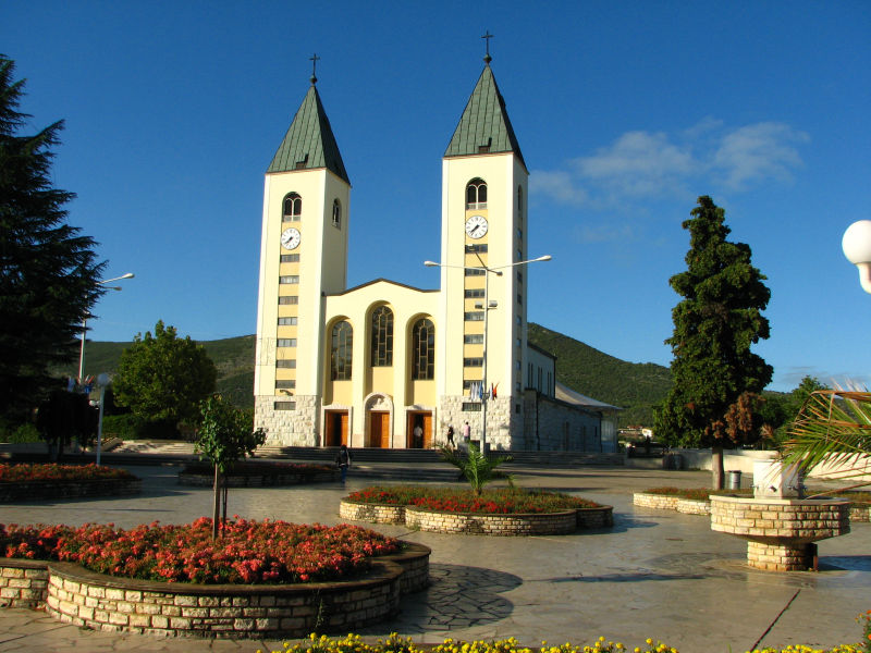 Dojeżdżając widzimy, że to już nie jest dawna mała wioska, a raczej nieduże miasteczko. Mnóstwo sklepów, restauracji, straganów. Obok różańców koszulki piłkarskiej reprezentacji Chorwacji. Właściwie dobrze trzeba się rozejrzeć, by w tym wszystkim odnaleźć kościół.