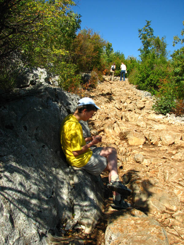 Wreszcie widzimy, że w takim tempie daleko nie zajdziemy. Trochę już idziemy, a jesteśmy dopiero na wysokości V stacji Drogi Krzyżowej. Rozdzielamy się. Pierwszego rodzinnego wejścia nie będzie. Idziemy osobno. Najpierw ja, podczas gdy Jurek z Piotrem powoli podchodzą, potem Jurek, a ja z Piotrem powoli schodzę. Idąc pod górę spotykam dużą chorwacką grupę. Przez jakiś czas idę z nimi, bo dobrze mi się odmawia z nimi różaniec, ale idą zbyt wolno. Nie mamy aż tak dużo czasu. Wyprzedzam i idę dalej własnym tempem.