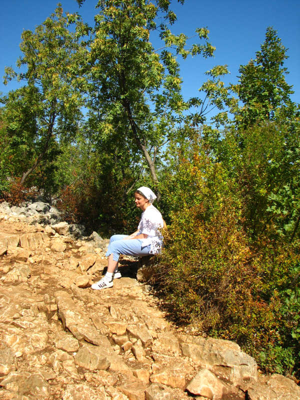 Zaskakują nas tłumy idące na górę - dorośli, dzieci, staruszkowie o laskach, chłopaki, dziewczyny. Niektórzy na bosaka. Idą ludzie pojedynczo, rodzinami, całymi grupami. Grupy modlą się na głos. Chorwacki, włoski, polski, angielski, francuski... Przesuwają się różne języki jak paciorki różańca. Wraz z pielgrzymami swoim własnym tempem posuwamy się my. Piotr co jakiś czas przysiada. Przysiadamy więc i my.