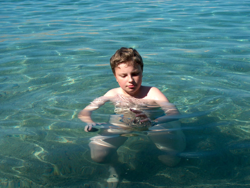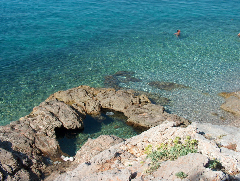 Ciepłe, krystaliczne morze. Chodziliśmy każdego dnia raz z rana po śniadaniu, kiedy jeszcze na wodę padał cień, a ludzi było jak na lekarstwo, i po zachodzie słońca. Wchodziliśmy na bosaka. Ajajaj, kamienie!!!