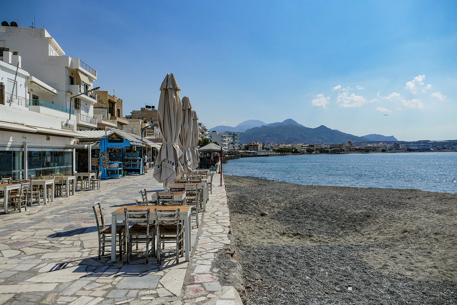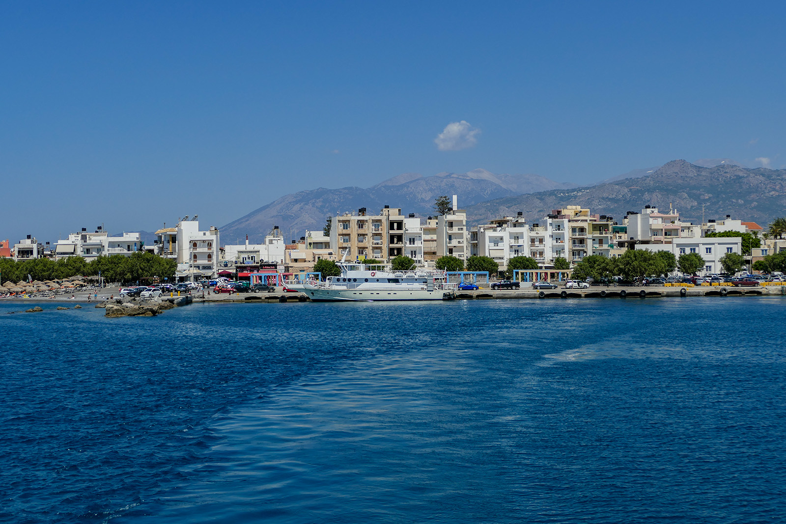Przystanek autobusowy znajduje się kilka kroków w prawo wychodząc z bramy hotelowej. Kierunek – Jerapetra, najbliższa większa miejscowość/miasto. Rozkład jazdy jest, ale kursowanie autobusów i ich dostępność jest losowa. Dwa razy sporo minut wcześniej wyszliśmy na przystanek i niestety musieliśmy wrócić do hotelu. Żaden autobus się nie zatrzymał, nawet machałem/kciuk jak przy łapaniu stopa i nic. Jeden z kierowców coś pokazywał, ale nie umiałem odczytać jego znaków migowych. Za trzecim razem udało nam się wstrzelić w autobus jeżdżący tak właściwie na krótkiej trasie. Bilet 1,6 E/os. To był rekonesans do tego miasta. I podczas tej przejażdżki dowiedzieliśmy się, że w Grecji wg prawa kierowca autobusu nie może zabierać więcej pasażerów niż jest miejsc siedzących. (albo od kogoś innego mieliśmy tę informację). Bo kary, mandaty itp.