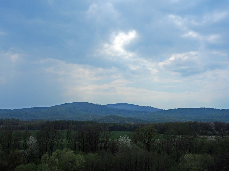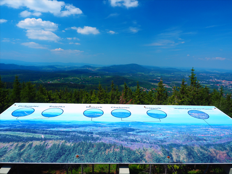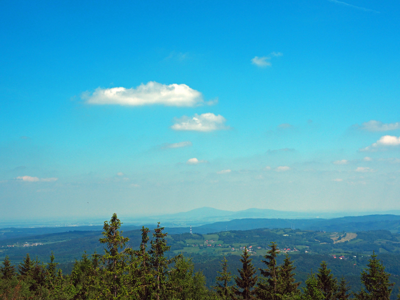 Chmury nad górami zaczynają się przerzedzać. Na wprost Biskupia Kopa. Widać nawet wieżę.