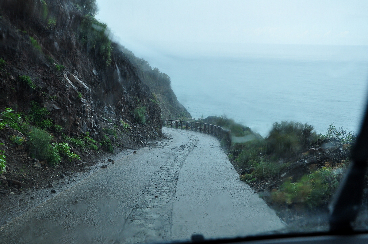 Zjeżdżając w dół do Benijo zaczyna porządnie lać i robi się niebezpiecznie. W miejscach gdzie nie ma płyt betonowych, tworzy się śliskie błoto...