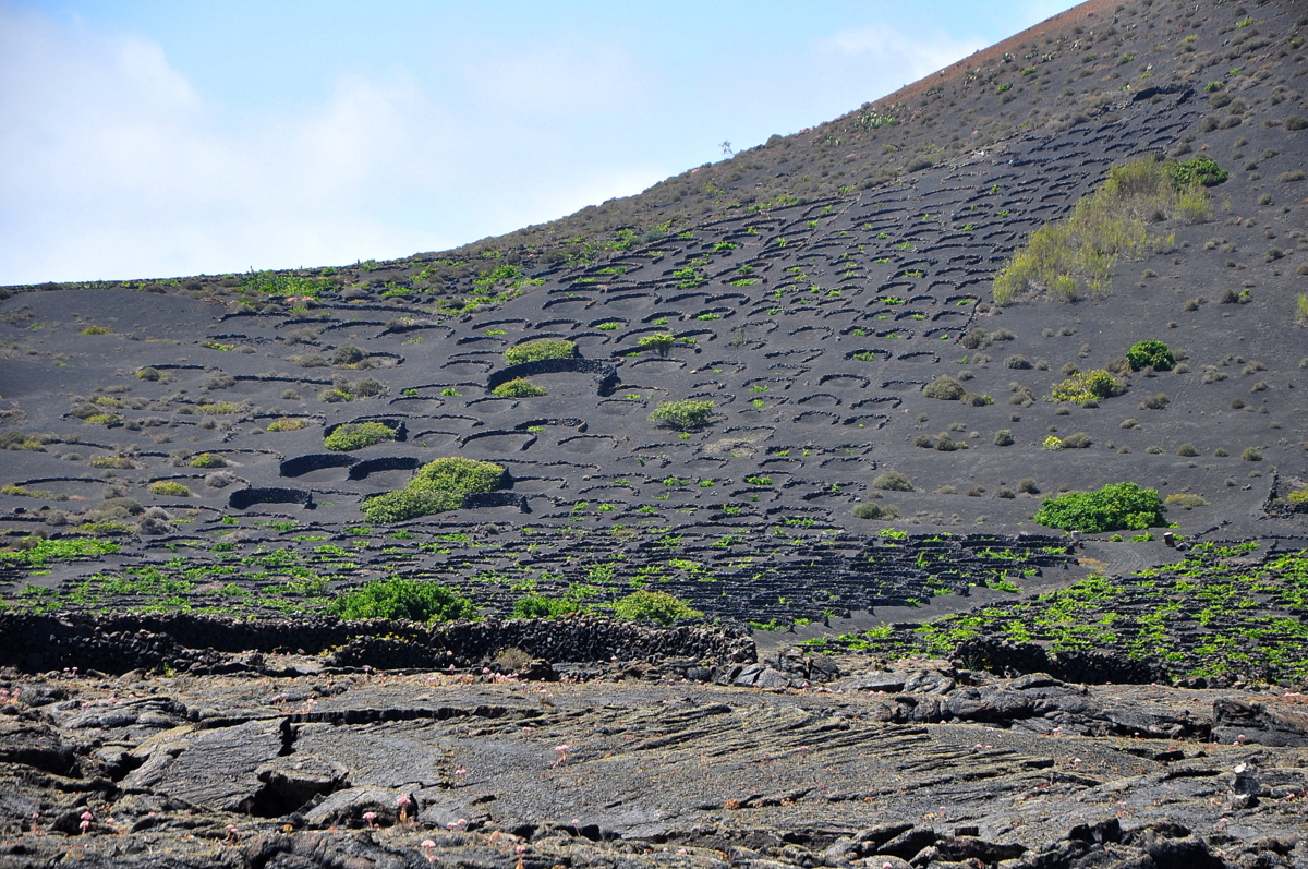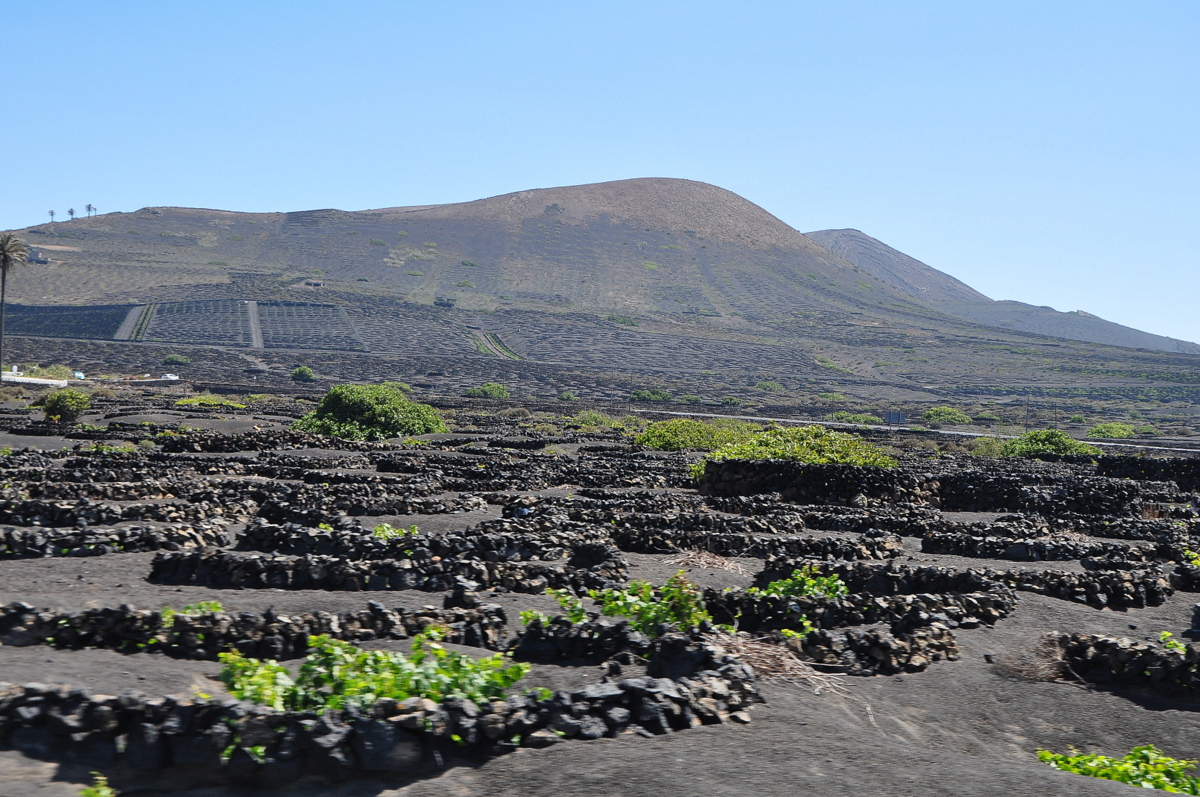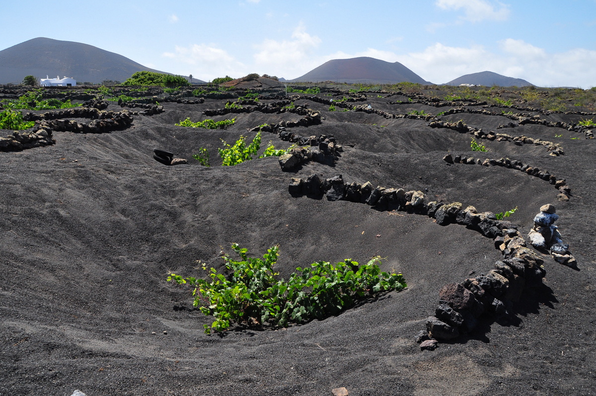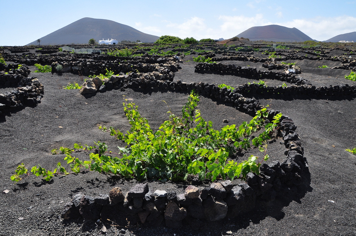 Nie spotka się tu jednak tradycyjnych pasów winorośli na zielonych wzgórzach znanych z Francji, Włoch, czy Hiszpanii. Krajobraz jest wręcz nieprawdopodobny jak na tego rodzaju uprawę – na pokrytych czarnym żwirem wulkanicznym stokach wykopane są stożkowate doły osłonięte przez murki w kształcie półksiężyców. W każdym dołku znajduje się jeden krzak winorośli. Dołki mają kumulować wilgoć, a murki