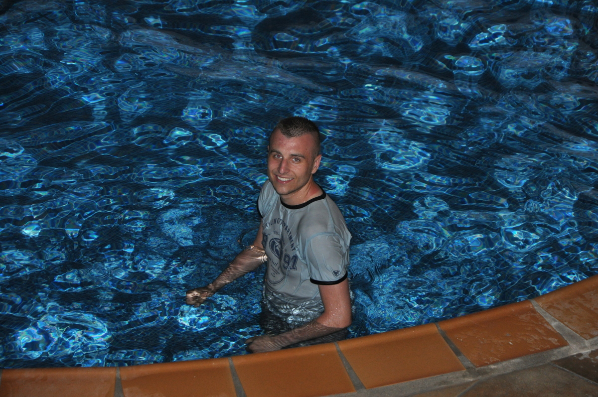 Spontanicznie rzucam młodemu tekst: „Zakład o 10 EUR, że nie wskoczysz tak jak stoisz w ubraniu do basenu”.