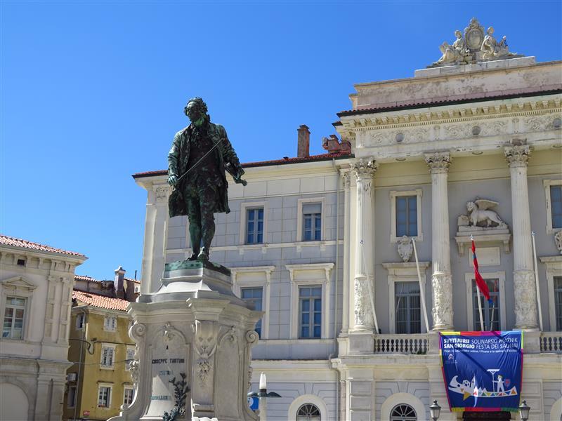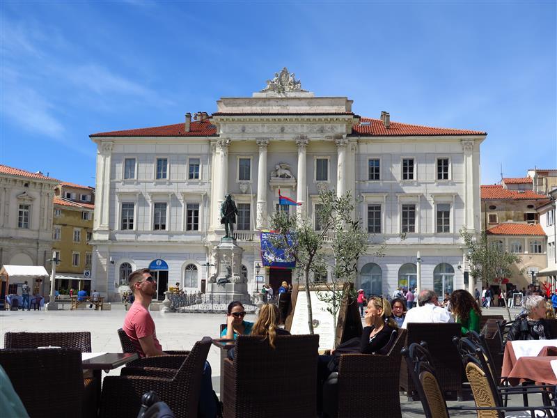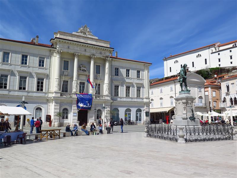 na placu wyłożonym białym kamieniem (kiedyś był tu basen portowy, ale sto lat temu go zasypano) możemy podziwiać ratusz z pomnikiem Giuseppe Tartiniego - włoskiego skrzypka i kompozytora urodzonego w Piranie: