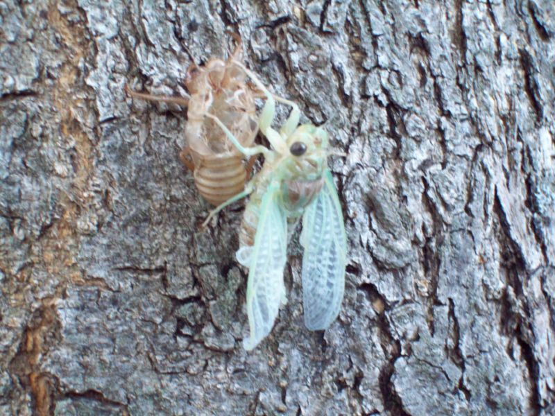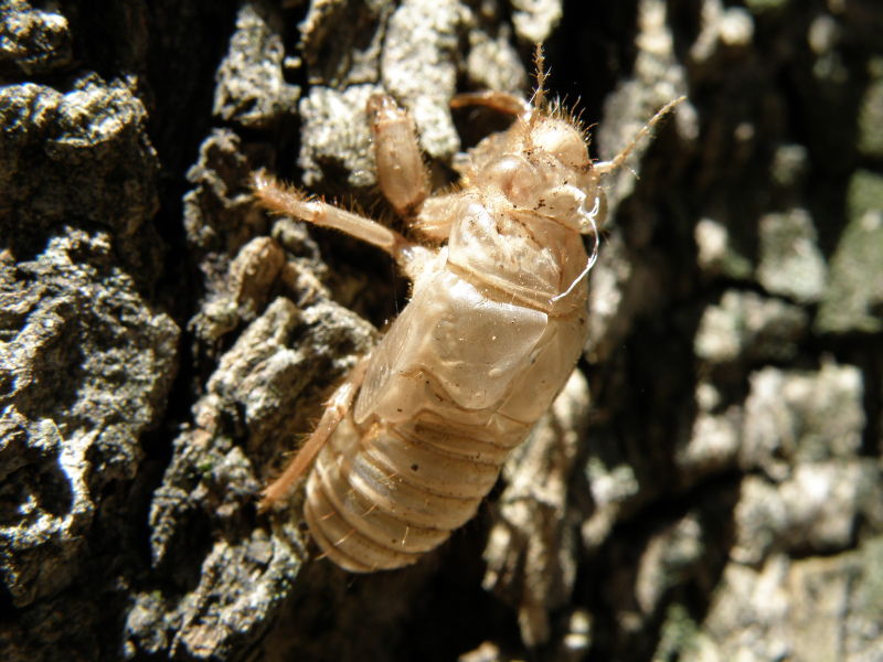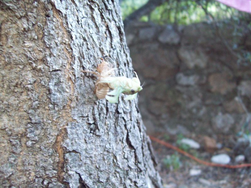 A oto "kokon", który pozostał po cykadzie. (Zdjęcie zrobione już następnego dnia.) Na pniach drzew koło naszego namiotu było ich wiele: