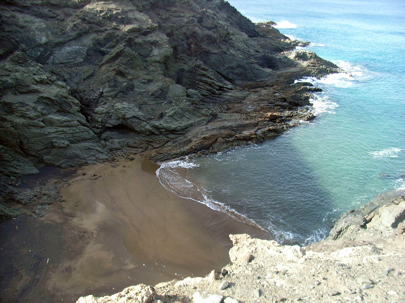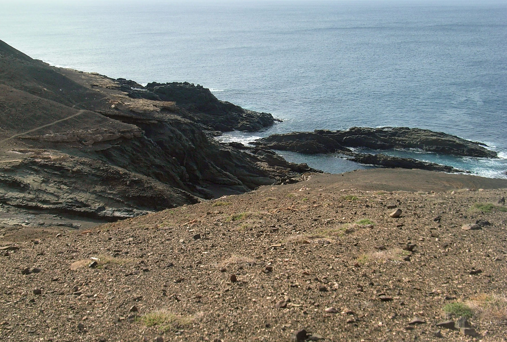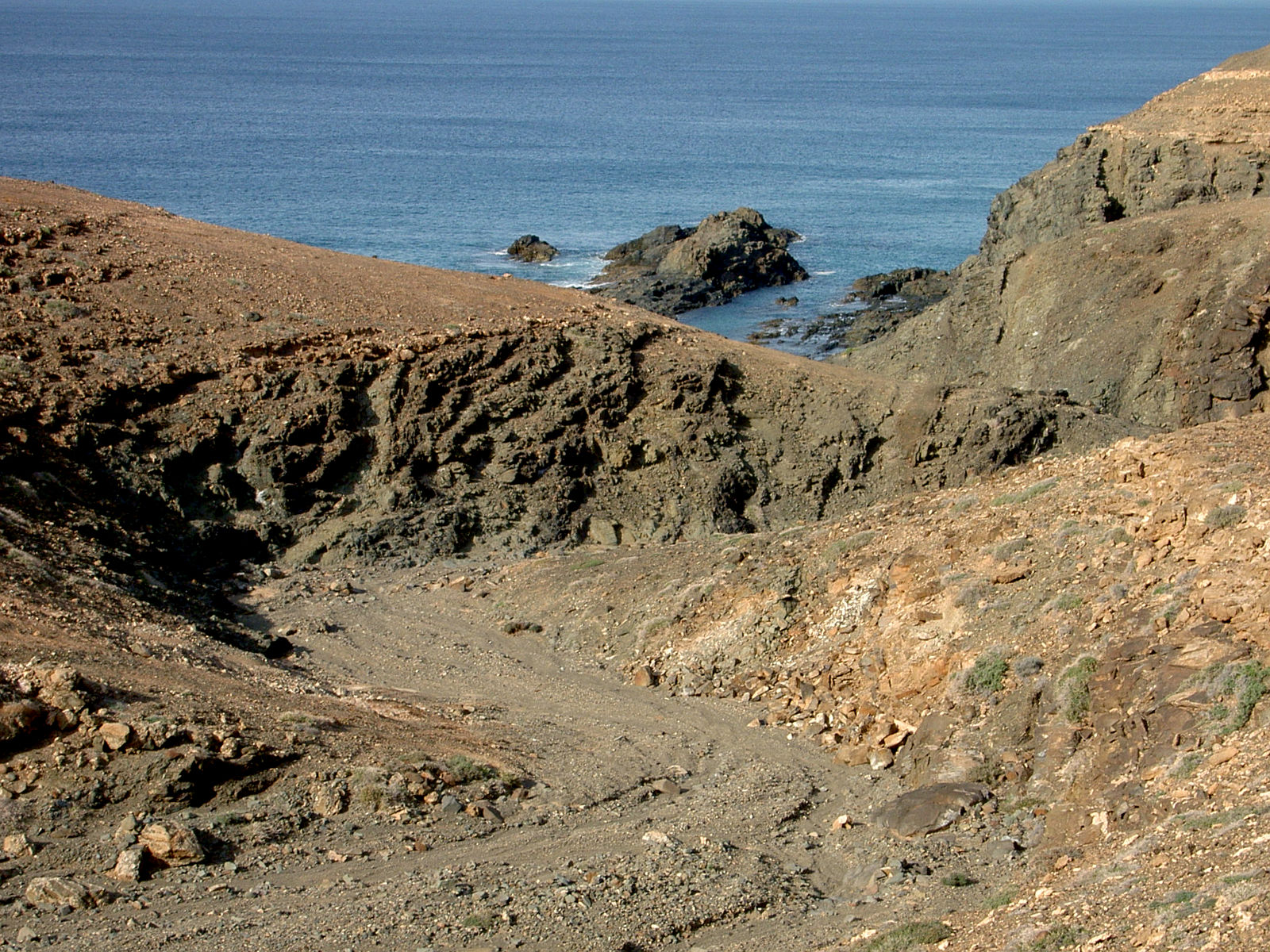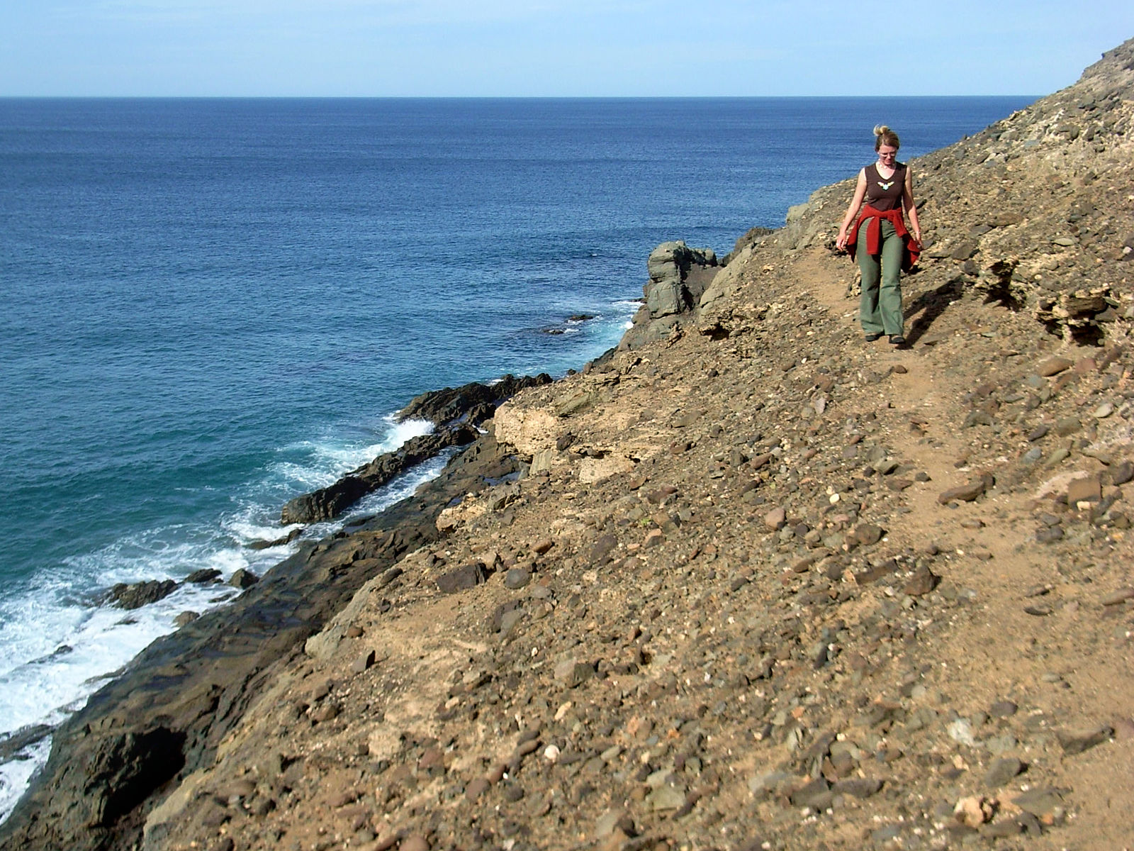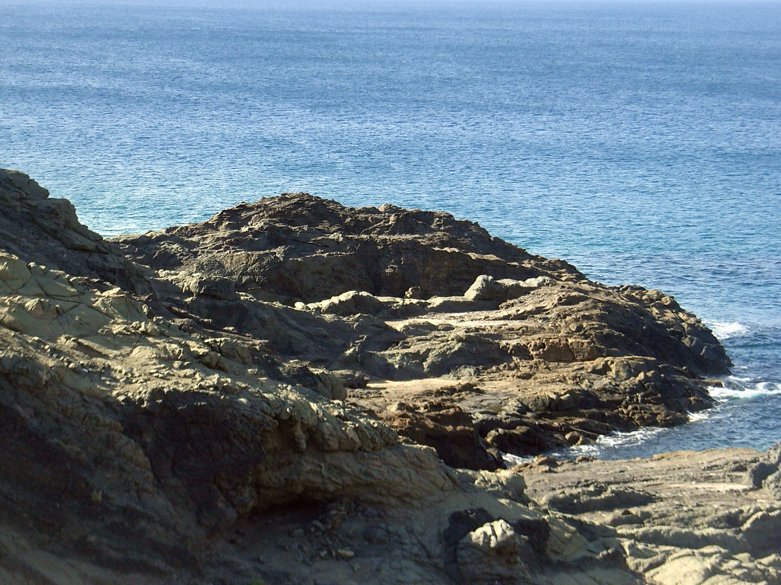Ścieżka - odchylając się nieco w kierunku zachodnim - wiedzie szerokimi zakosami, lawirując pomiędzy kolejnymi obniżeniami, którymi w jakichś niesłychanie rzadkich sytuacjach zapewne spływa woda z okolicznych wzgórz. Kiedy docieramy do otoczonej skałami, zupełnie bezludnej plaży, zakładamy, że stąd możemy już zawrócić.