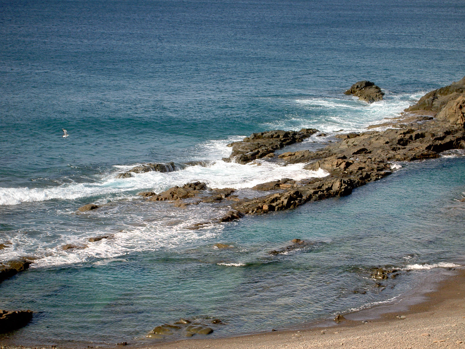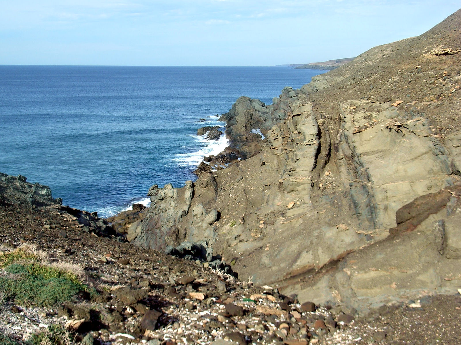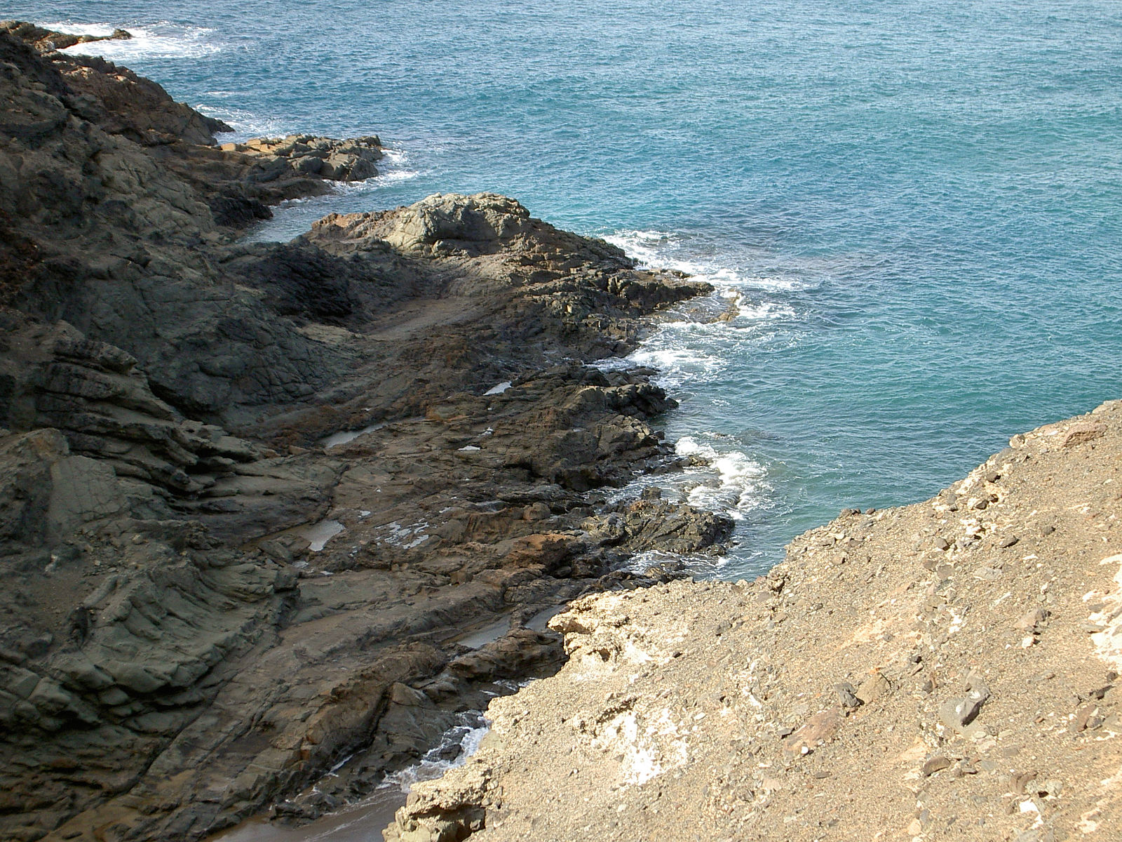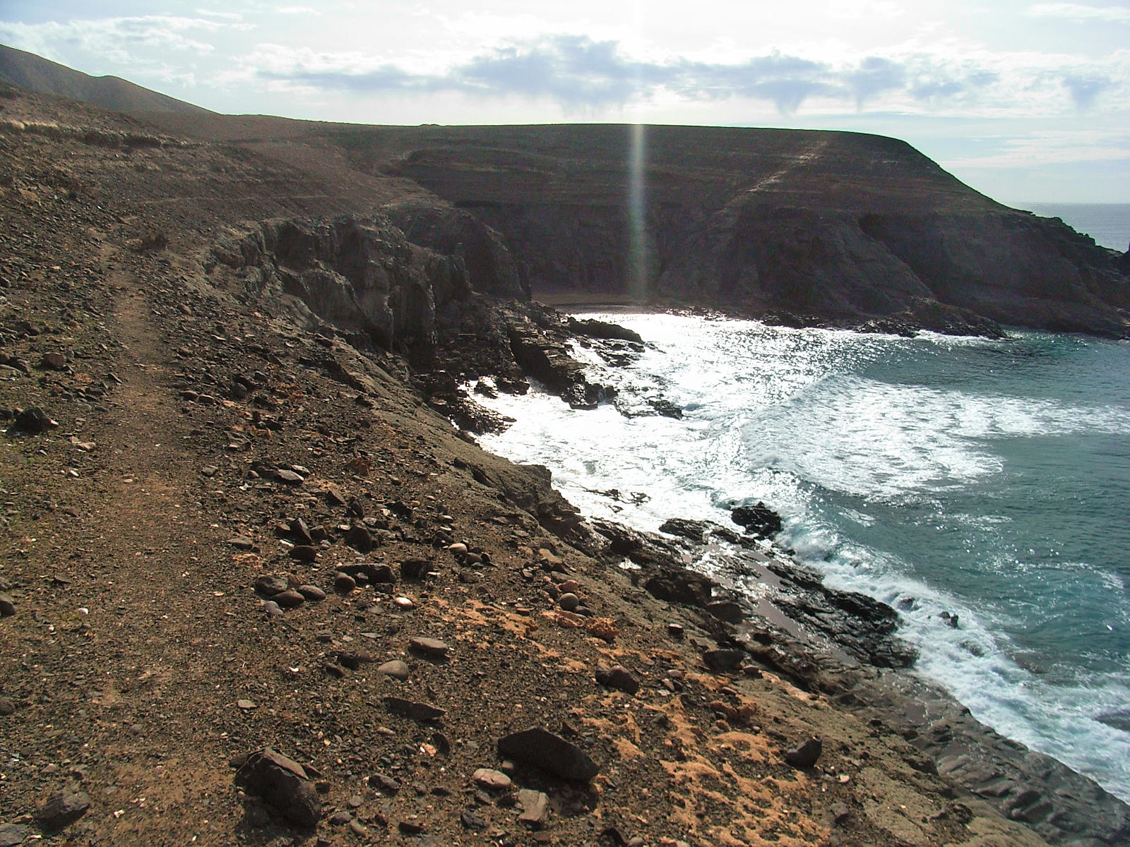 Ścieżka - odchylając się nieco w kierunku zachodnim - wiedzie szerokimi zakosami, lawirując pomiędzy kolejnymi obniżeniami, którymi w jakichś niesłychanie rzadkich sytuacjach zapewne spływa woda z okolicznych wzgórz. Kiedy docieramy do otoczonej skałami, zupełnie bezludnej plaży, zakładamy, że stąd możemy już zawrócić.