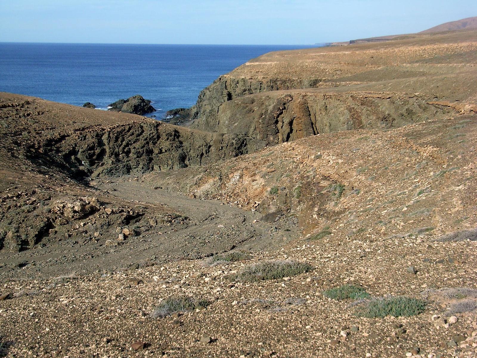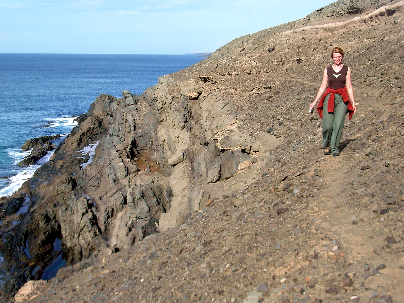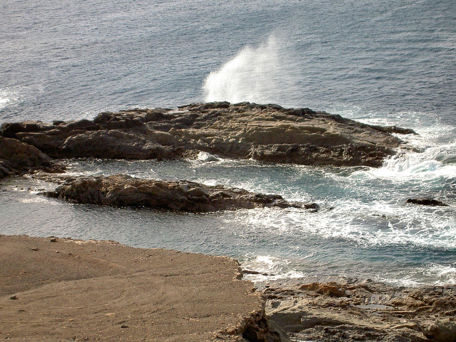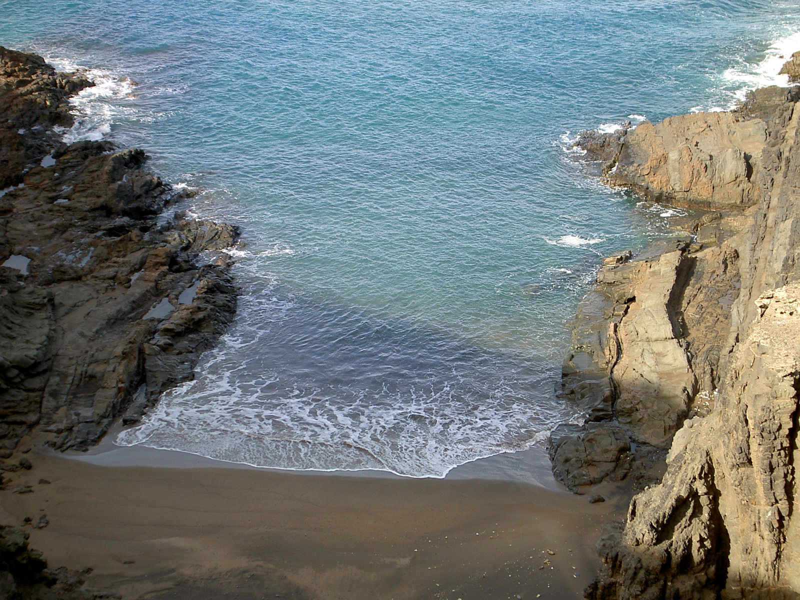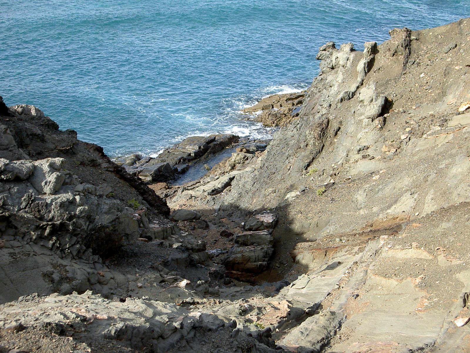 Ścieżka - odchylając się nieco w kierunku zachodnim - wiedzie szerokimi zakosami, lawirując pomiędzy kolejnymi obniżeniami, którymi w jakichś niesłychanie rzadkich sytuacjach zapewne spływa woda z okolicznych wzgórz. Kiedy docieramy do otoczonej skałami, zupełnie bezludnej plaży, zakładamy, że stąd możemy już zawrócić.