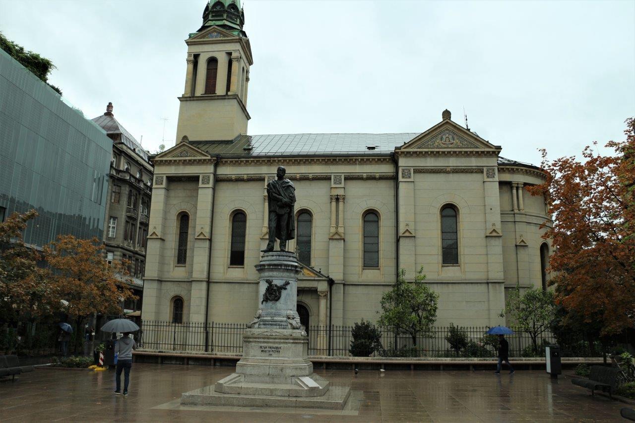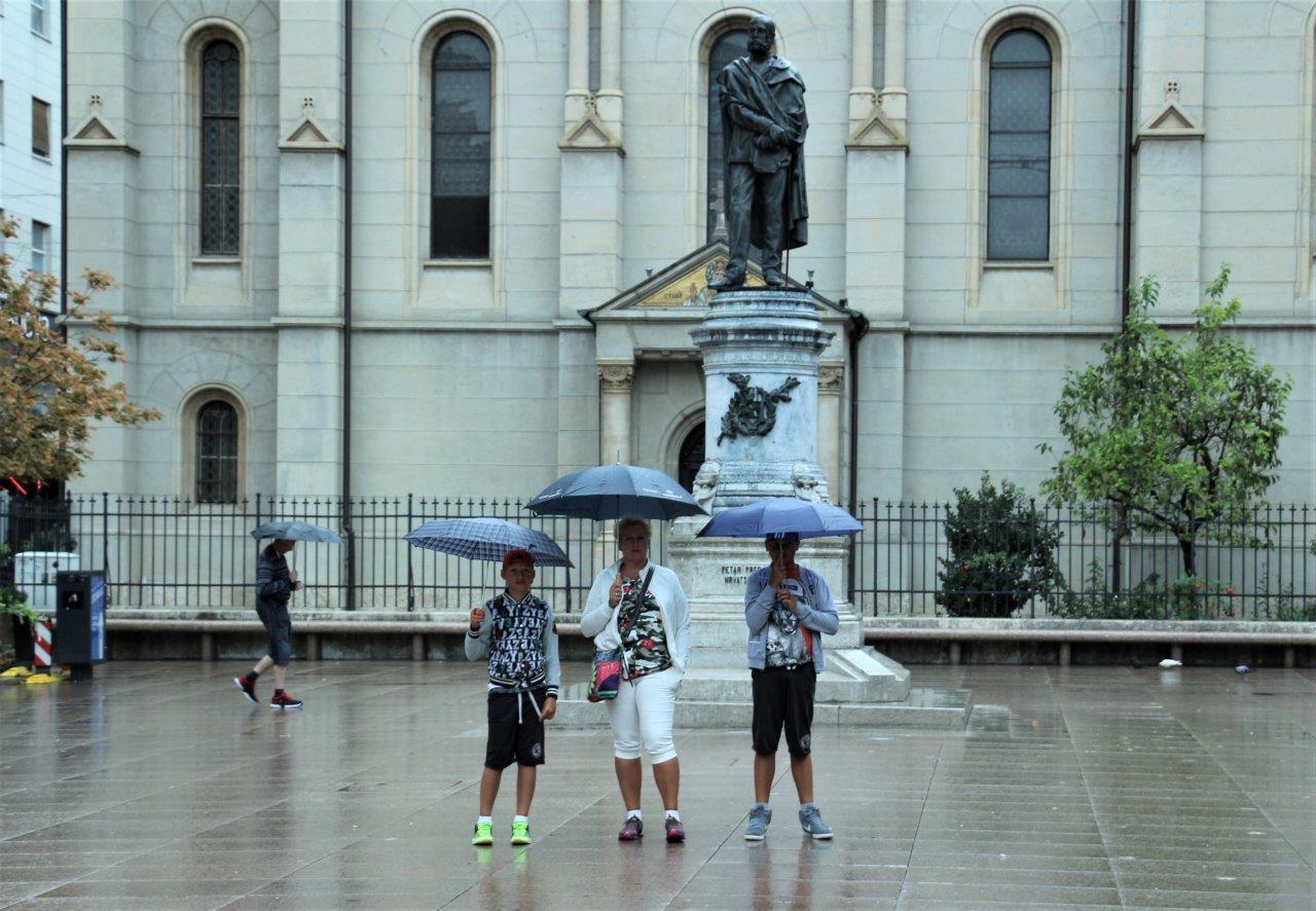 Rodzinka zapozowała pod pomnikiem Petara Preradovića - XIX wiecznego poety chorwackiego. Plac na którym stoimy nosi też jego imię. Kościół za pomnikiem to Katedra Prawosławna.
