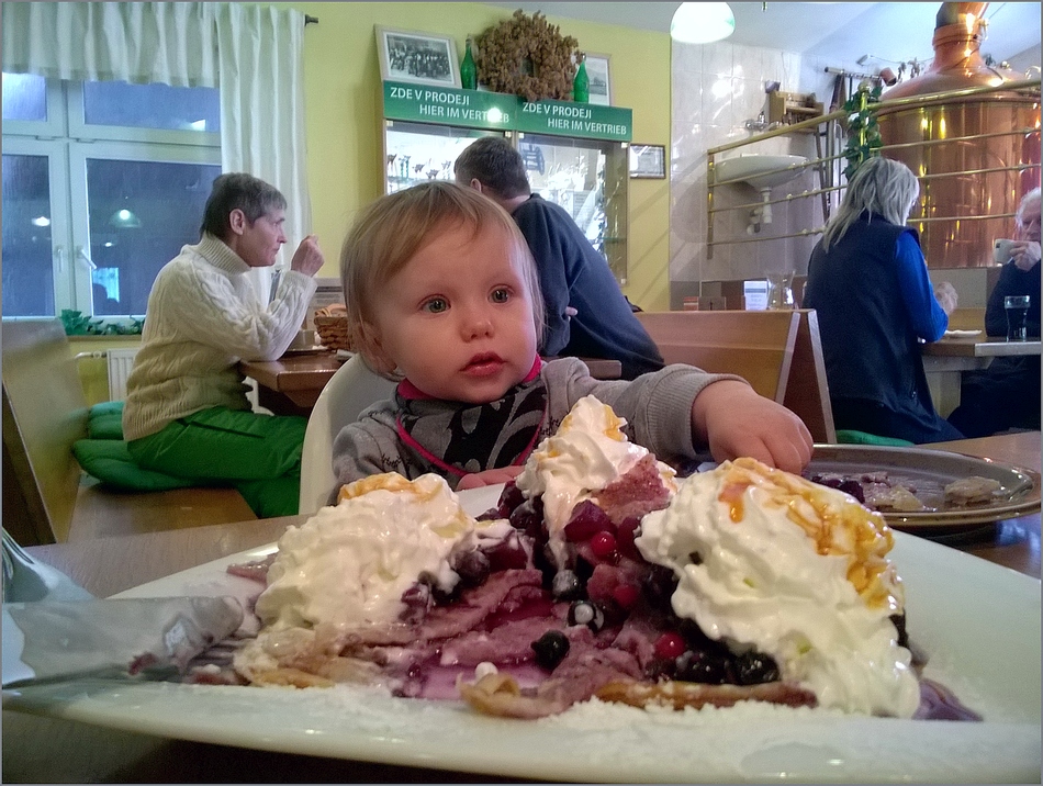 . Wprawdzie w cenie biletu zawarty jest kupon na jeden napój w restauracji, ale zamiast piwka wybraliśmy kawkę, bo właśnie była na nią pora. Dziecko kawki nie pija, ale że nie miało też biletu "na mleczko", więc rodzice zafundowali Lilce coś ekstra. Fakt, najciekawsze w naleśniku było wyławianie porzeczek z nadzienia